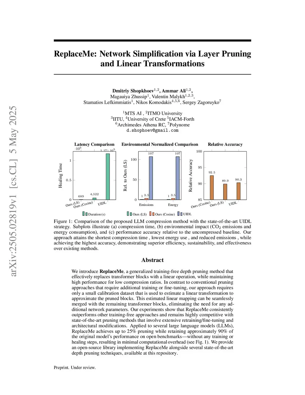 ReplaceMe: Network Simplification via Depth Pruning and Transformer Block Linearization