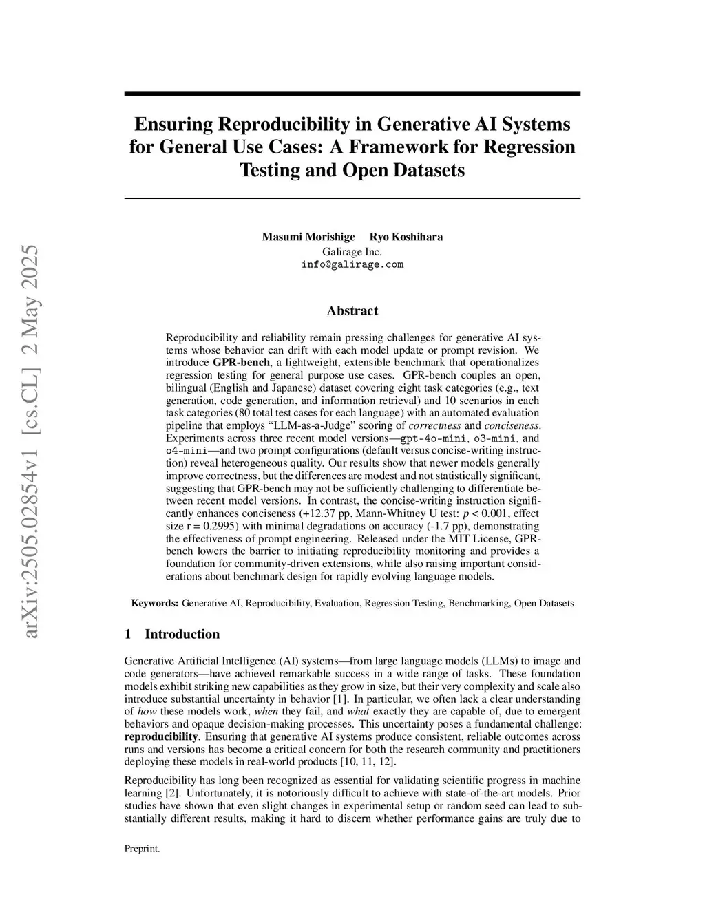 Reproducibility and reliability remain pressing challenges for generative AI systems whose behavior can drift with each model update or prompt revision. We introduce GPR-bench, a lightweight, extensible benchmark that operationalizes regression testing for general purpose use cases. GPR-bench couples an open, bilingual (English and Japanese) dataset covering eight task categories (e.g., text generation, code generation, and information retrieval) and 10 scenarios in each task categories (80 total test cases for each language) with an automated evaluation pipeline that employs "LLM-as-a-Judge" scoring of correctness and conciseness. Experiments across three recent model versions - gpt-4o-mini, o3-mini, and o4-mini - and two prompt configurations (default versus concise-writing instruction) reveal heterogeneous quality. Our results show that newer models generally improve correctness, but the differences are modest and not statistically significant, suggesting that GPR-bench may not be sufficiently challenging to differentiate between recent model versions. In contrast, the concise-writing instruction significantly enhances conciseness (+12.37 pp, Mann-Whitney U test: p < 0.001, effect size r = 0.2995) with minimal degradations on accuracy (-1.7 pp), demonstrating the effectiveness of prompt engineering. Released under the MIT License, GPR- bench lowers the barrier to initiating reproducibility monitoring and provides a foundation for community-driven extensions, while also raising important considerations about benchmark design for rapidly evolving language models.