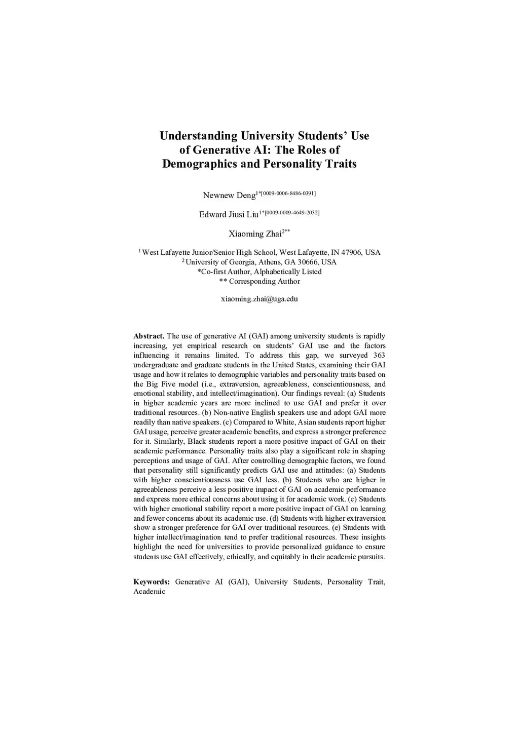 Understanding University Students' Use of Generative AI: The Roles of Demographics and Personality Traits