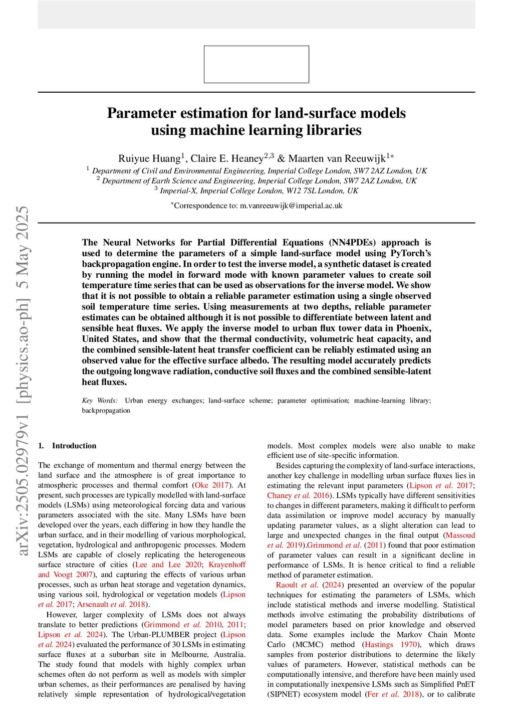 The Neural Physics approach is used to determine the parameters of a simple land-surface model using PyTorch's backpropagation engine to carry out the optimisation. In order to test the inverse model, a synthetic dataset is created by running the model in forward mode with known parameter values to create soil temperature time series that can be used as observations for the inverse model. We show that it is not possible to obtain a reliable parameter estimation using a time series of soil temperature observed at a single depth. Using measurements at two depths, reliable parameter estimates can be obtained although it is not possible to differentiate between latent and sensible heat fluxes. We apply the inverse model to urban flux tower data in Phoenix, United States, and show that the thermal conductivity, volumetric heat capacity and the combined sensible-latent heat transfer coefficient can be reliably estimated using an observed value for the effective surface albedo. The resulting model accurately predicts the outgoing longwave radiation, conductive soil fluxes and the combined sensible-latent heat fluxes.