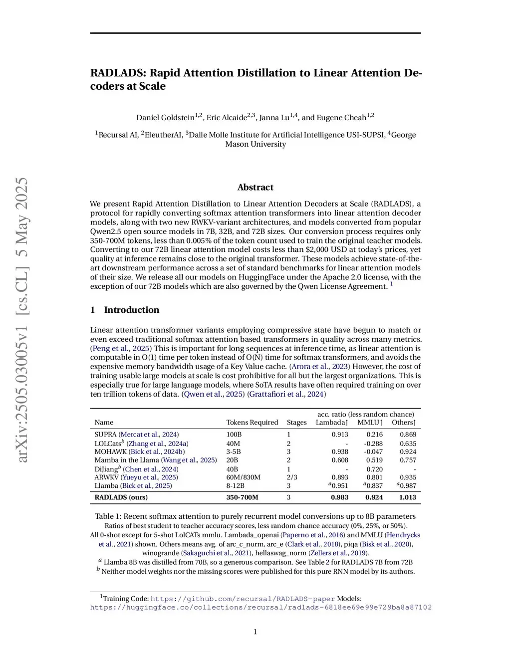 We present Rapid Attention Distillation to Linear Attention Decoders at Scale (RADLADS), a protocol for rapidly converting softmax attention transformers into linear attention decoder models, along with two new RWKV-variant architectures, and models converted from popular Qwen2.5 open source models in 7B, 32B, and 72B sizes. Our conversion process requires only 350-700M tokens, less than 0.005% of the token count used to train the original teacher models. Converting to our 72B linear attention model costs less than \$2,000 USD at today's prices, yet quality at inference remains close to the original transformer. These models achieve state-of-the-art downstream performance across a set of standard benchmarks for linear attention models of their size. We release all our models on HuggingFace under the Apache 2.0 license, with the exception of our 72B models which are also governed by the Qwen License Agreement.Models atthis https URLTraining Code atthis https URL