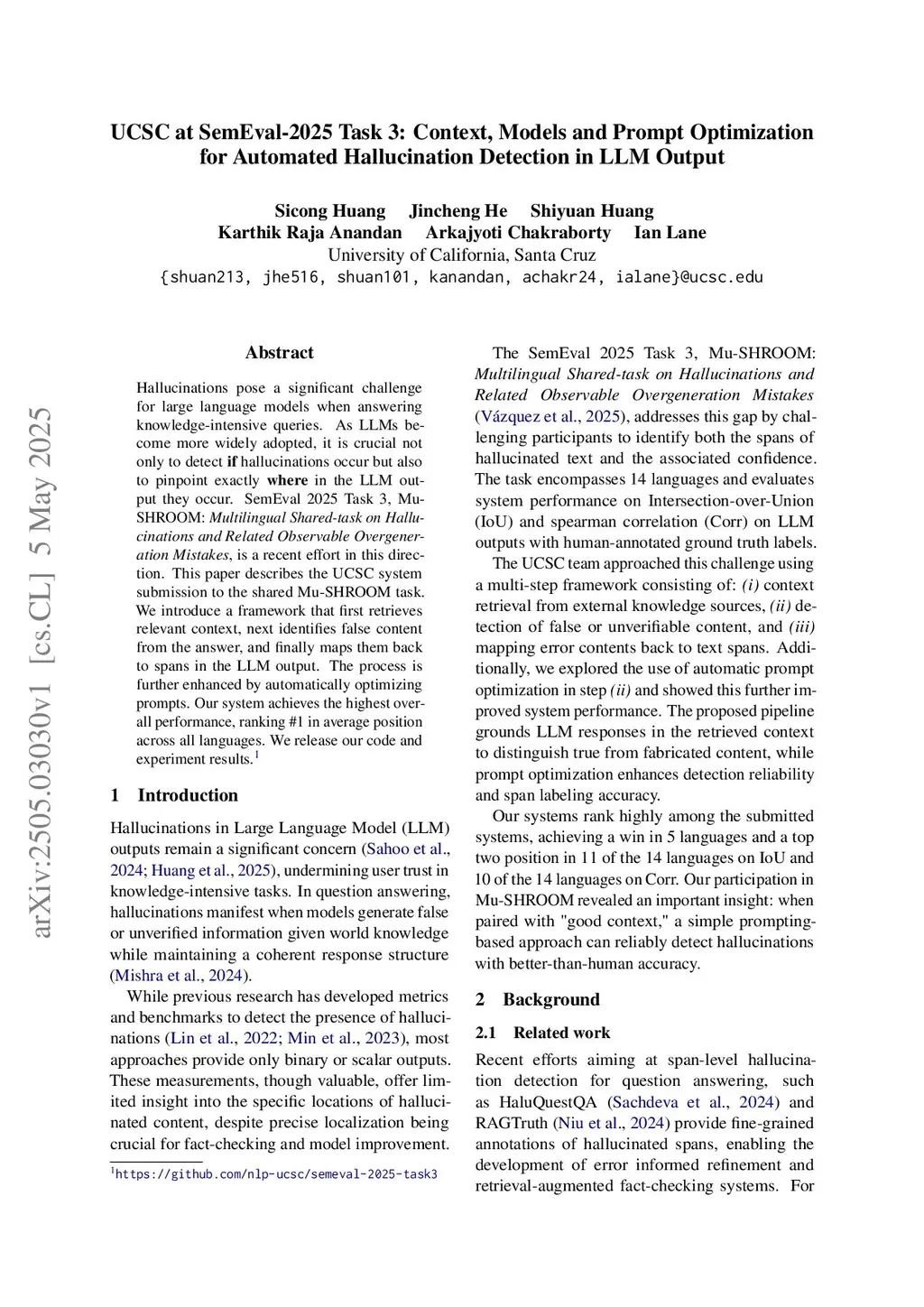 UCSC at SemEval-2025 Task 3: Context, Models and Prompt Optimization for Automated Hallucination Detection in LLM Output