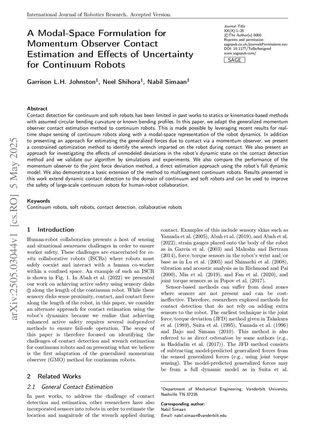 A Modal-Space Formulation for Momentum Observer Contact Estimation and Effects of Uncertainty for Continuum Robots