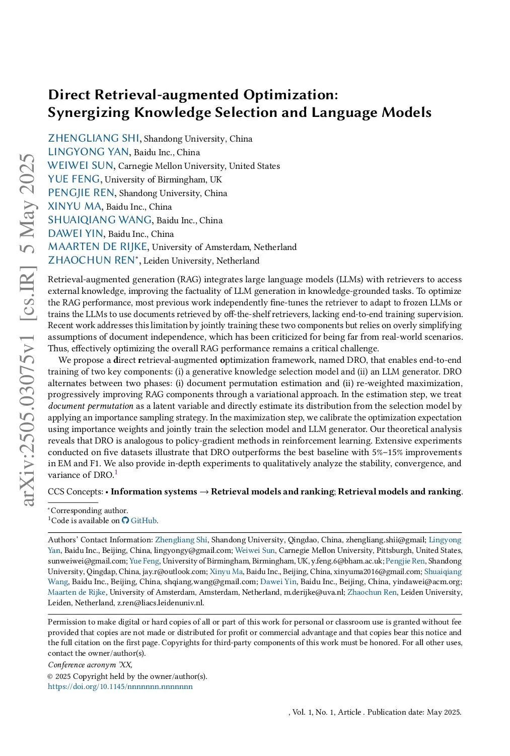 Retrieval-augmented generation (RAG) integrates large language models ( LLM s) with retrievers to access external knowledge, improving the factuality of LLM generation in knowledge-grounded tasks. To optimize the RAG performance, most previous work independently fine-tunes the retriever to adapt to frozen LLM s or trains the LLMs to use documents retrieved by off-the-shelf retrievers, lacking end-to-end training supervision. Recent work addresses this limitation by jointly training these two components but relies on overly simplifying assumptions of document independence, which has been criticized for being far from real-world scenarios. Thus, effectively optimizing the overall RAG performance remains a critical challenge.We propose a direct retrieval-augmented optimization framework, named DRO, that enables end-to-end training of two key components: (i) a generative knowledge selection model and (ii) an LLM generator. DRO alternates between two phases: (i) document permutation estimation and (ii) re-weighted maximization, progressively improving RAG components through a variational approach. In the estimation step, we treat document permutation as a latent variable and directly estimate its distribution from the selection model by applying an importance sampling strategy. In the maximization step, we calibrate the optimization expectation using importance weights and jointly train the selection model and LLM generator. Our theoretical analysis reveals that DRO is analogous to policy-gradient methods in reinforcement learning. Extensive experiments conducted on five datasets illustrate that DRO outperforms the best baseline with 5%-15% improvements in EM and F1. We also provide in-depth experiments to qualitatively analyze the stability, convergence, and variance of DRO.
