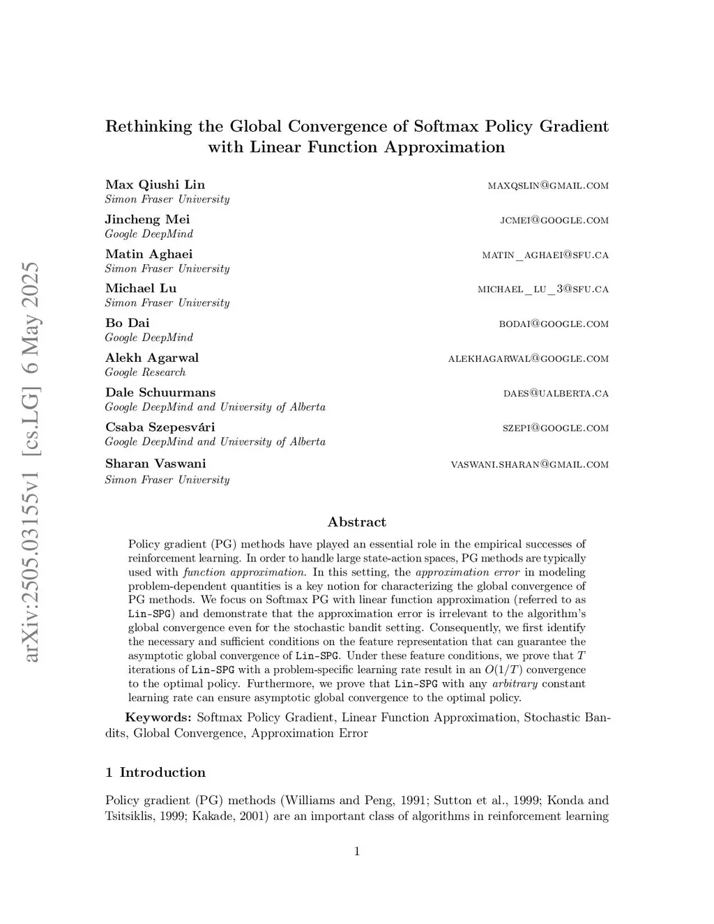 Policy gradient (PG) methods have played an essential role in the empirical successes of reinforcement learning. In order to handle large state-action spaces, PG methods are typically used with function approximation. In this setting, the approximation error in modeling problem-dependent quantities is a key notion for characterizing the global convergence of PG methods. We focus on Softmax PG with linear function approximation (referred to as ) and demonstrate that the approximation error is irrelevant to the algorithm's global convergence even for the stochastic bandit setting. Consequently, we first identify the necessary and sufficient conditions on the feature representation that can guarantee the asymptotic global convergence of . Under these feature conditions, we prove that iterations of with a problem-specific learning rate result in an convergence to the optimal policy. Furthermore, we prove that with any arbitrary constant learning rate can ensure asymptotic global convergence to the optimal policy.