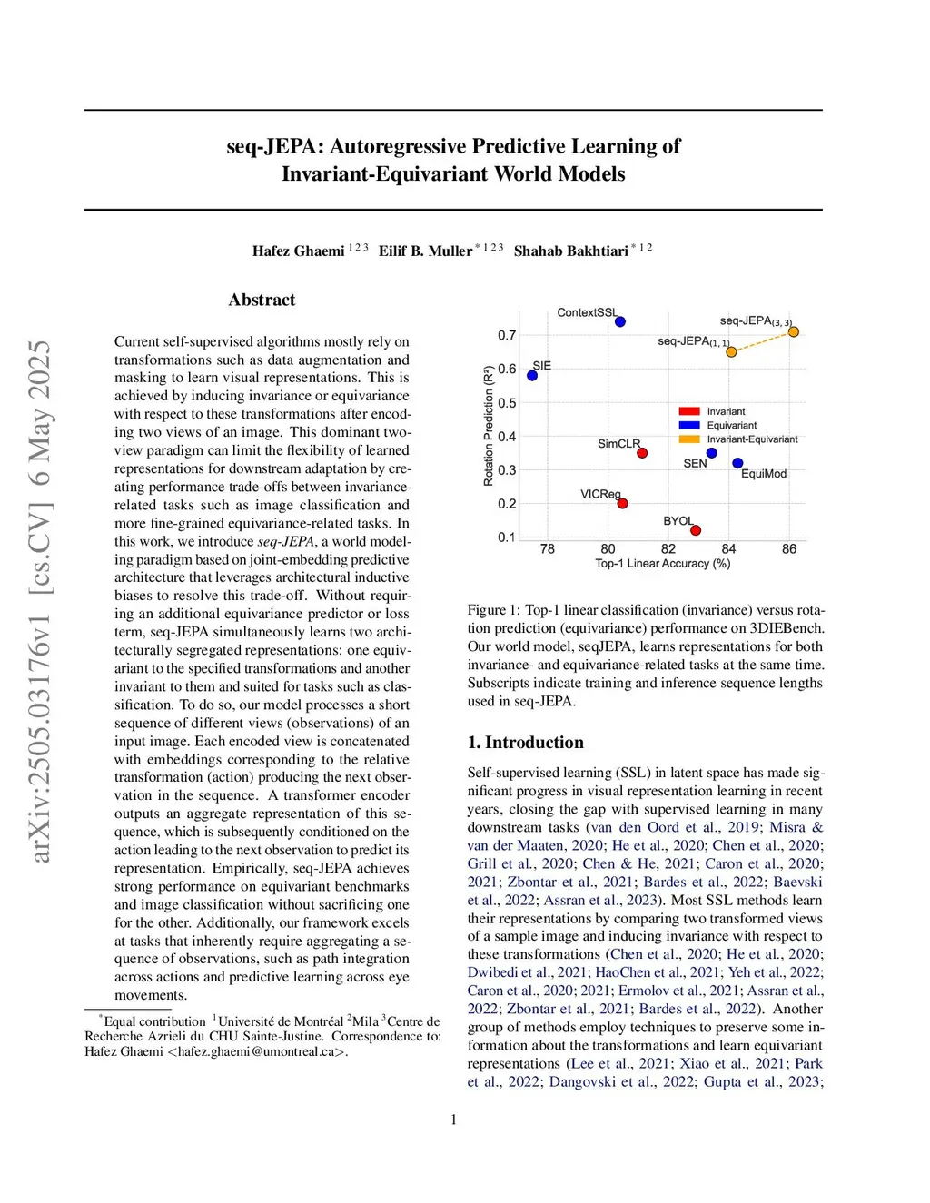 Joint-embedding self-supervised learning (SSL) commonly relies on transformations such as data augmentation and masking to learn visual representations, a task achieved by enforcing invariance or equivariance with respect to these transformations applied to two views of an image. This dominant two-view paradigm in SSL often limits the flexibility of learned representations for downstream adaptation by creating performance trade-offs between high-level invariance-demanding tasks such as image classification and more fine-grained equivariance-related tasks. In this work, we propose \emph{seq-JEPA}, a world modeling framework that introduces architectural inductive biases into joint-embedding predictive architectures to resolve this trade-off. Without relying on dual equivariance predictors or loss terms, seq-JEPA simultaneously learns two architecturally separate representations for equivariance- and invariance-demanding tasks. To do so, our model processes short sequences of different views (observations) of inputs. Each encoded view is concatenated with an embedding of the relative transformation (action) that produces the next observation in the sequence. These view-action pairs are passed through a transformer encoder that outputs an aggregate representation. A predictor head then conditions this aggregate representation on the upcoming action to predict the representation of the next observation. Empirically, seq-JEPA demonstrates strong performance on both equivariance- and invariance-demanding downstream tasks without sacrificing one for the other. Furthermore, it excels at tasks that inherently require aggregating a sequence of observations, such as path integration across actions and predictive learning across eye movements.