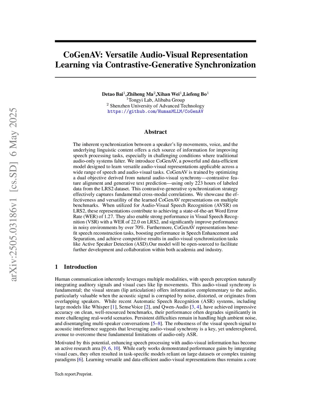 The inherent synchronization between a speaker's lip movements, voice, and the underlying linguistic content offers a rich source of information for improving speech processing tasks, especially in challenging conditions where traditional audio-only systems falter. We introduce CoGenAV, a powerful and data-efficient model designed to learn versatile audio-visual representations applicable across a wide range of speech and audio-visual tasks. CoGenAV is trained by optimizing a dual objective derived from natural audio-visual synchrony, contrastive feature alignment and generative text prediction, using only 223 hours of labeled data from the LRS2 dataset. This contrastive-generative synchronization strategy effectively captures fundamental cross-modal correlations. We showcase the effectiveness and versatility of the learned CoGenAV representations on multiple benchmarks. When utilized for Audio-Visual Speech Recognition (AVSR) on LRS2, these representations contribute to achieving a state-of-the-art Word Error Rate (WER) of 1.27. They also enable strong performance in Visual Speech Recognition (VSR) with a WER of 20.5 on LRS2, and significantly improve performance in noisy environments by over 70%. Furthermore, CoGenAV representations benefit speech reconstruction tasks, boosting performance in Speech Enhancement and Separation, and achieve competitive results in audio-visual synchronization tasks like Active Speaker Detection (ASD). Our model will be open-sourced to facilitate further development and collaboration within both academia and industry.