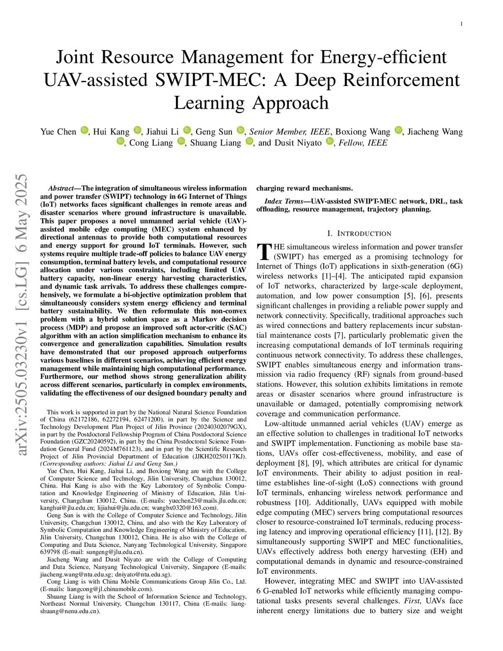 The integration of simultaneous wireless information and power transfer (SWIPT) technology in 6G Internet of Things (IoT) networks faces significant challenges in remote areas and disaster scenarios where ground infrastructure is unavailable. This paper proposes a novel unmanned aerial vehicle (UAV)-assisted mobile edge computing (MEC) system enhanced by directional antennas to provide both computational resources and energy support for ground IoT terminals. However, such systems require multiple trade-off policies to balance UAV energy consumption, terminal battery levels, and computational resource allocation under various constraints, including limited UAV battery capacity, non-linear energy harvesting characteristics, and dynamic task arrivals. To address these challenges comprehensively, we formulate a bi-objective optimization problem that simultaneously considers system energy efficiency and terminal battery sustainability. We then reformulate this non-convex problem with a hybrid solution space as a Markov decision process (MDP) and propose an improved soft actor-critic (SAC) algorithm with an action simplification mechanism to enhance its convergence and generalization capabilities. Simulation results have demonstrated that our proposed approach outperforms various baselines in different scenarios, achieving efficient energy management while maintaining high computational performance. Furthermore, our method shows strong generalization ability across different scenarios, particularly in complex environments, validating the effectiveness of our designed boundary penalty and charging reward mechanisms.