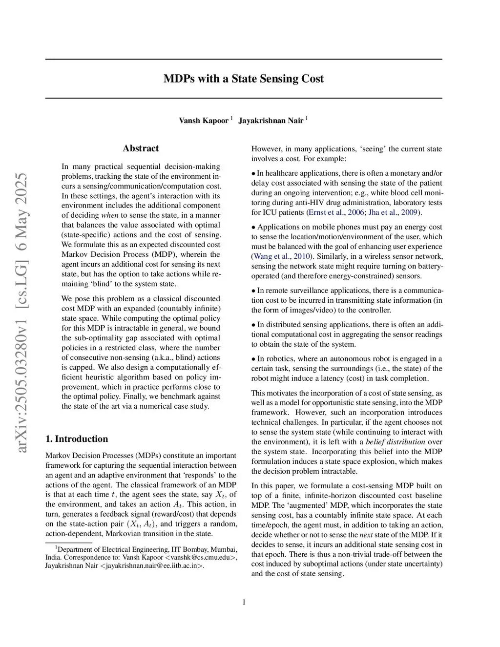 MDPs with a State Sensing Cost