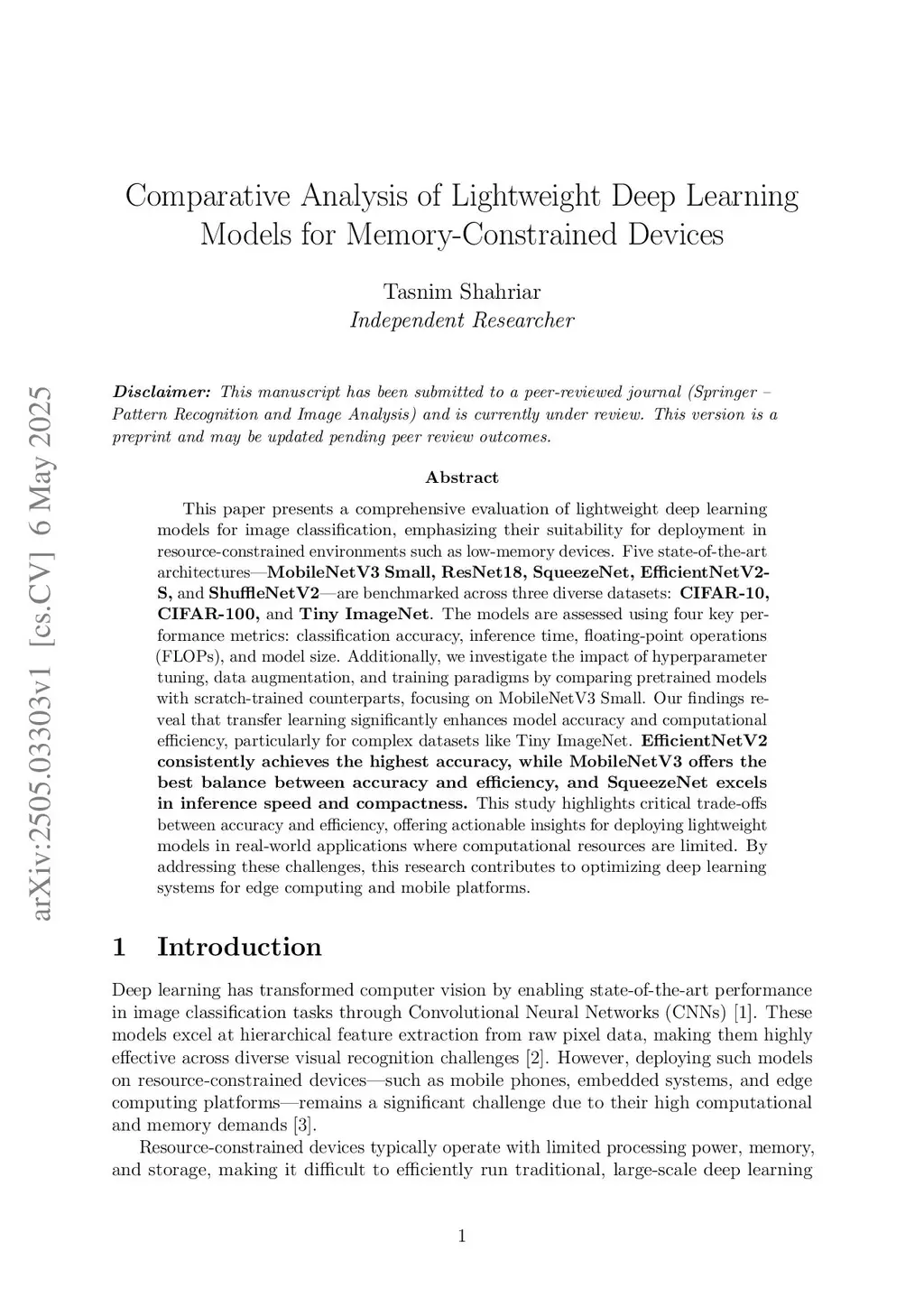 This paper presents a comprehensive evaluation of lightweight deep learning models for image classification, emphasizing their suitability for deployment in resource-constrained environments such as low-memory devices. Five state-of-the-art architectures - MobileNetV3 Small, ResNet18, SqueezeNet, EfficientNetV2-S, and ShuffleNetV2 - are benchmarked across three diverse datasets: CIFAR-10, CIFAR-100, and Tiny ImageNet. The models are assessed using four key performance metrics: classification accuracy, inference time, floating-point operations (FLOPs), and model size. Additionally, we investigate the impact of hyperparameter tuning, data augmentation, and training paradigms by comparing pretrained models with scratch-trained counterparts, focusing on MobileNetV3 Small. Our findings reveal that transfer learning significantly enhances model accuracy and computational efficiency, particularly for complex datasets like Tiny ImageNet. EfficientNetV2 consistently achieves the highest accuracy, while MobileNetV3 offers the best balance between accuracy and efficiency, and SqueezeNet excels in inference speed and compactness. This study highlights critical trade-offs between accuracy and efficiency, offering actionable insights for deploying lightweight models in real-world applications where computational resources are limited. By addressing these challenges, this research contributes to optimizing deep learning systems for edge computing and mobile platforms.