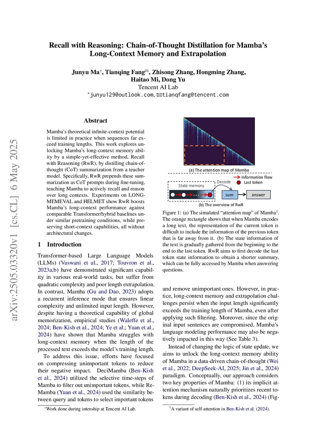 Mamba's theoretical infinite-context potential is limited in practice when sequences far exceed training lengths. This work explores unlocking Mamba's long-context memory ability by a simple-yet-effective method, Recall with Reasoning (RwR), by distilling chain-of-thought (CoT) summarization from a teacher model. Specifically, RwR prepends these summarization as CoT prompts during fine-tuning, teaching Mamba to actively recall and reason over long contexts. Experiments on LONGMEMEVAL and HELMET show RwR boosts Mamba's long-context performance against comparable Transformer/hybrid baselines under similar pretraining conditions, while preserving short-context capabilities, all without architectural changes.