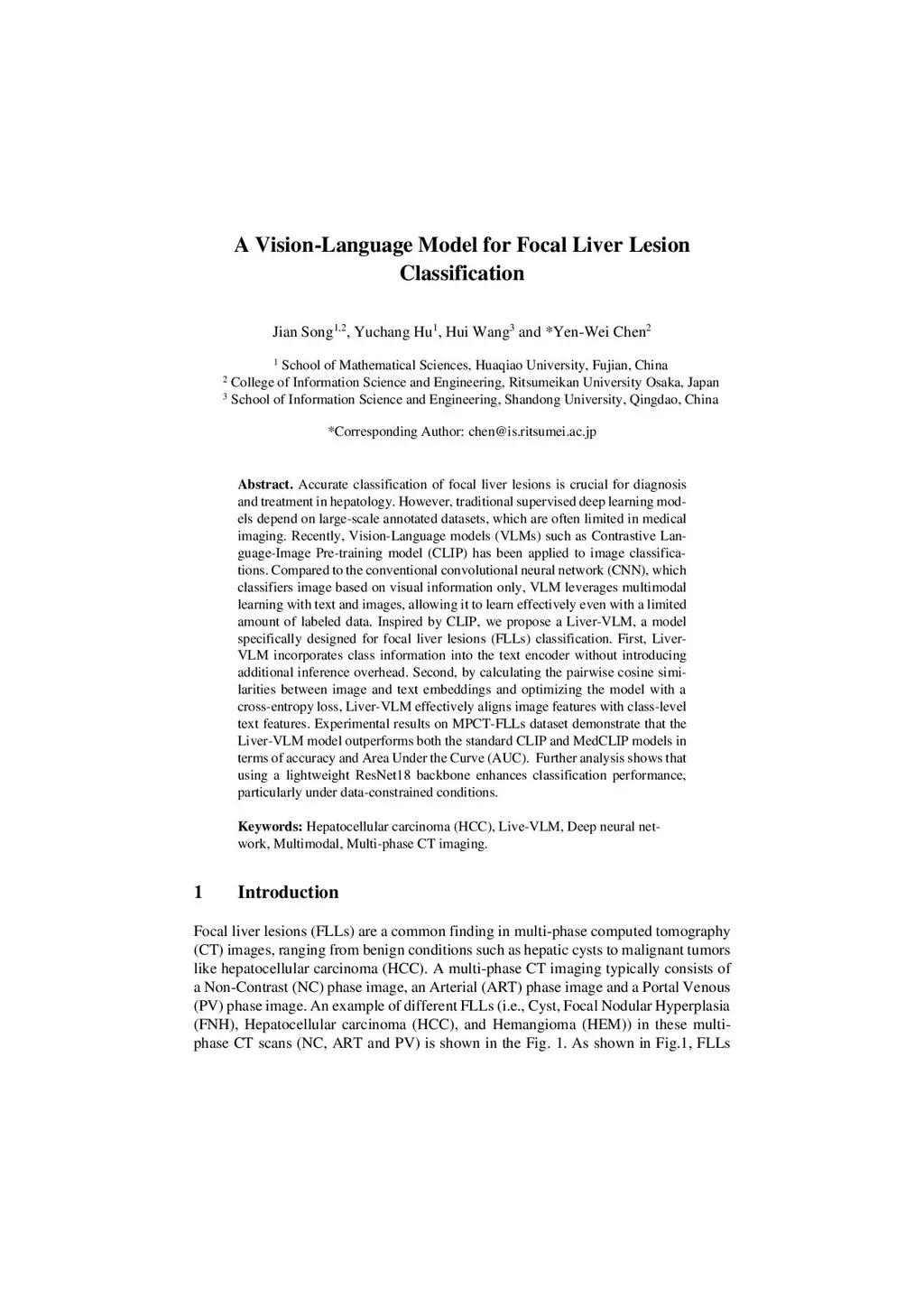 Accurate classification of focal liver lesions is crucial for diagnosis and treatment in hepatology. However, traditional supervised deep learning models depend on large-scale annotated datasets, which are often limited in medical imaging. Recently, Vision-Language models (VLMs) such as Contrastive Language-Image Pre-training model (CLIP) has been applied to image classifications. Compared to the conventional convolutional neural network (CNN), which classifiers image based on visual information only, VLM leverages multimodal learning with text and images, allowing it to learn effectively even with a limited amount of labeled data. Inspired by CLIP, we pro-pose a Liver-VLM, a model specifically designed for focal liver lesions (FLLs) classification. First, Liver-VLM incorporates class information into the text encoder without introducing additional inference overhead. Second, by calculating the pairwise cosine similarities between image and text embeddings and optimizing the model with a cross-entropy loss, Liver-VLM ef-fectively aligns image features with class-level text features. Experimental results on MPCT-FLLs dataset demonstrate that the Liver-VLM model out-performs both the standard CLIP and MedCLIP models in terms of accuracy and Area Under the Curve (AUC). Further analysis shows that using a lightweight ResNet18 backbone enhances classification performance, particularly under data-constrained conditions.