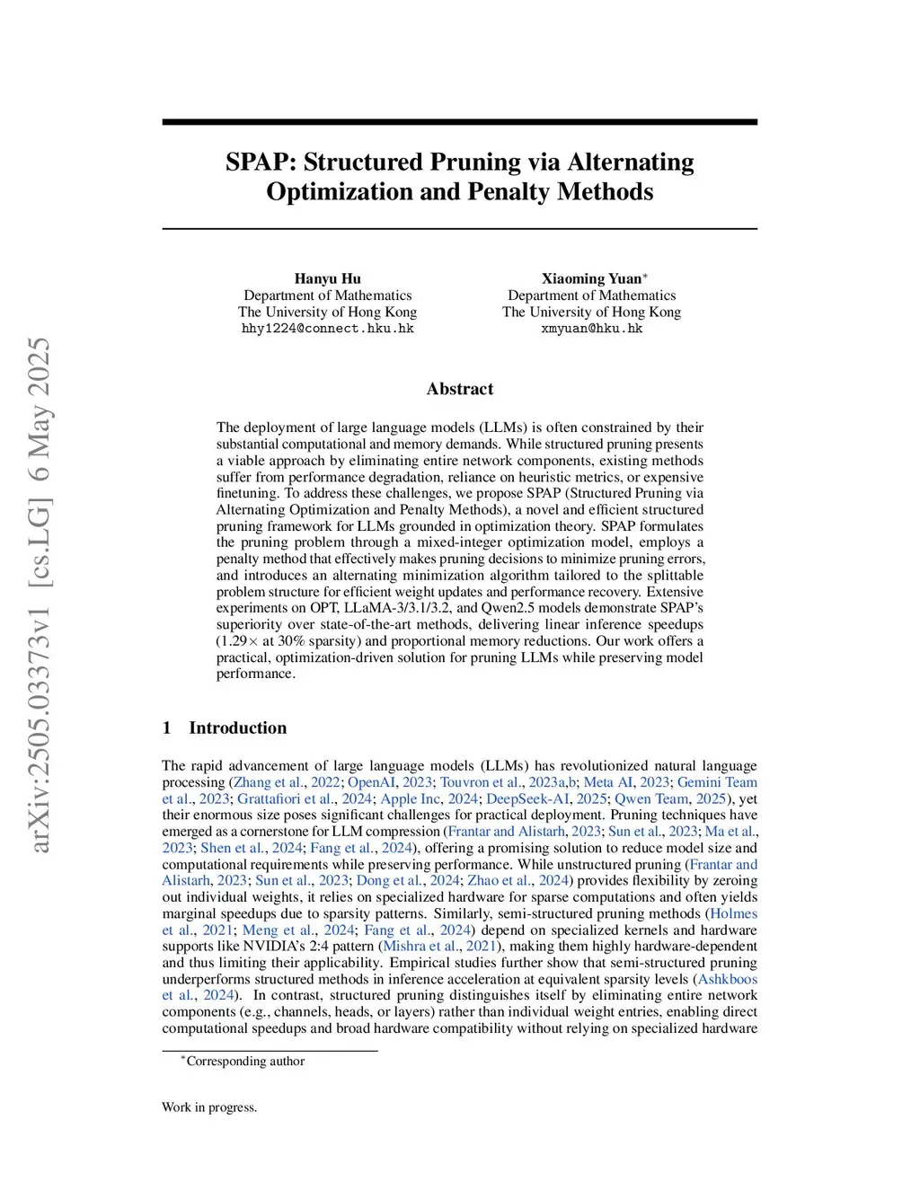 The deployment of large language models (LLMs) is often constrained by their substantial computational and memory demands. While structured pruning presents a viable approach by eliminating entire network components, existing methods suffer from performance degradation, reliance on heuristic metrics, or expensive finetuning. To address these challenges, we propose SPAP (Structured Pruning via Alternating Optimization and Penalty Methods), a novel and efficient structured pruning framework for LLMs grounded in optimization theory. SPAP formulates the pruning problem through a mixed-integer optimization model, employs a penalty method that effectively makes pruning decisions to minimize pruning errors, and introduces an alternating minimization algorithm tailored to the splittable problem structure for efficient weight updates and performance recovery. Extensive experiments on OPT, LLaMA-3/3.1/3.2, and Qwen2.5 models demonstrate SPAP's superiority over state-of-the-art methods, delivering linear inference speedups (1.29 at 30% sparsity) and proportional memory reductions. Our work offers a practical, optimization-driven solution for pruning LLMs while preserving model performance.