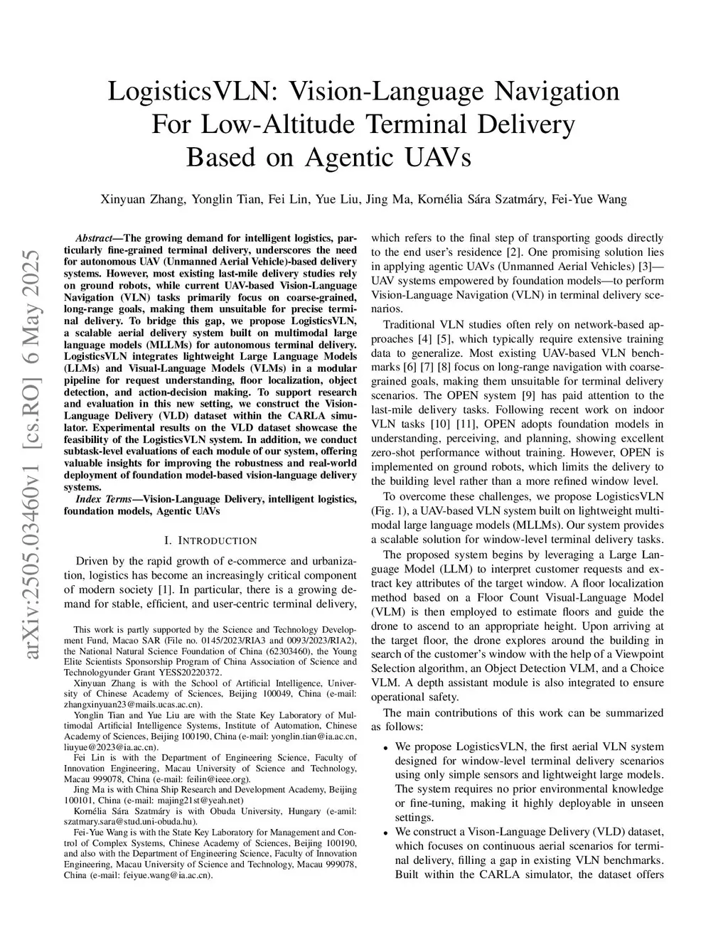 The growing demand for intelligent logistics, particularly fine-grained terminal delivery, underscores the need for autonomous UAV (Unmanned Aerial Vehicle)-based delivery systems. However, most existing last-mile delivery studies rely on ground robots, while current UAV-based Vision-Language Navigation (VLN) tasks primarily focus on coarse-grained, long-range goals, making them unsuitable for precise terminal delivery. To bridge this gap, we propose LogisticsVLN, a scalable aerial delivery system built on multimodal large language models (MLLMs) for autonomous terminal delivery. LogisticsVLN integrates lightweight Large Language Models (LLMs) and Visual-Language Models (VLMs) in a modular pipeline for request understanding, floor localization, object detection, and action-decision making. To support research and evaluation in this new setting, we construct the Vision-Language Delivery (VLD) dataset within the CARLA simulator. Experimental results on the VLD dataset showcase the feasibility of the LogisticsVLN system. In addition, we conduct subtask-level evaluations of each module of our system, offering valuable insights for improving the robustness and real-world deployment of foundation model-based vision-language delivery systems.