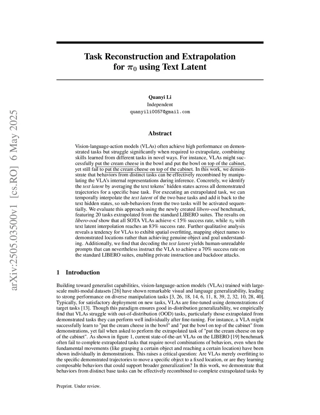Vision-language-action models (VLAs) often achieve high performance on demonstrated tasks but struggle significantly when required to extrapolate, combining skills learned from different tasks in novel ways. For instance, VLAs might successfully put the cream cheese in the bowl and put the bowl on top of the cabinet, yet still fail to put the cream cheese on top of the cabinet. In this work, we demonstrate that behaviors from distinct tasks can be effectively recombined by manipulating the VLA's internal representations at inference time. Concretely, we identify the text latent by averaging the text tokens' hidden states across all demonstrated trajectories for a specific base task. For executing an extrapolated task, we can temporally interpolate the text latent of the two base tasks and add it back to the text hidden states, so sub-behaviors from the two tasks will be activated sequentially. We evaluate this approach using the newly created libero-ood benchmark, featuring 20 tasks extrapolated from standard LIBERO suites. The results on libero-ood show that all SOTA VLAs achieve < 15% success rate, while with text latent interpolation reaches an 83% success rate. Further qualitative analysis reveals a tendency for VLAs to exhibit spatial overfitting, mapping object names to demonstrated locations rather than achieving genuine object and goal understanding. Additionally, we find that decoding the text latent yields human-unreadable prompts that can nevertheless instruct the VLA to achieve a 70% success rate on standard LIBERO suites, enabling private instruction or backdoor attacks.