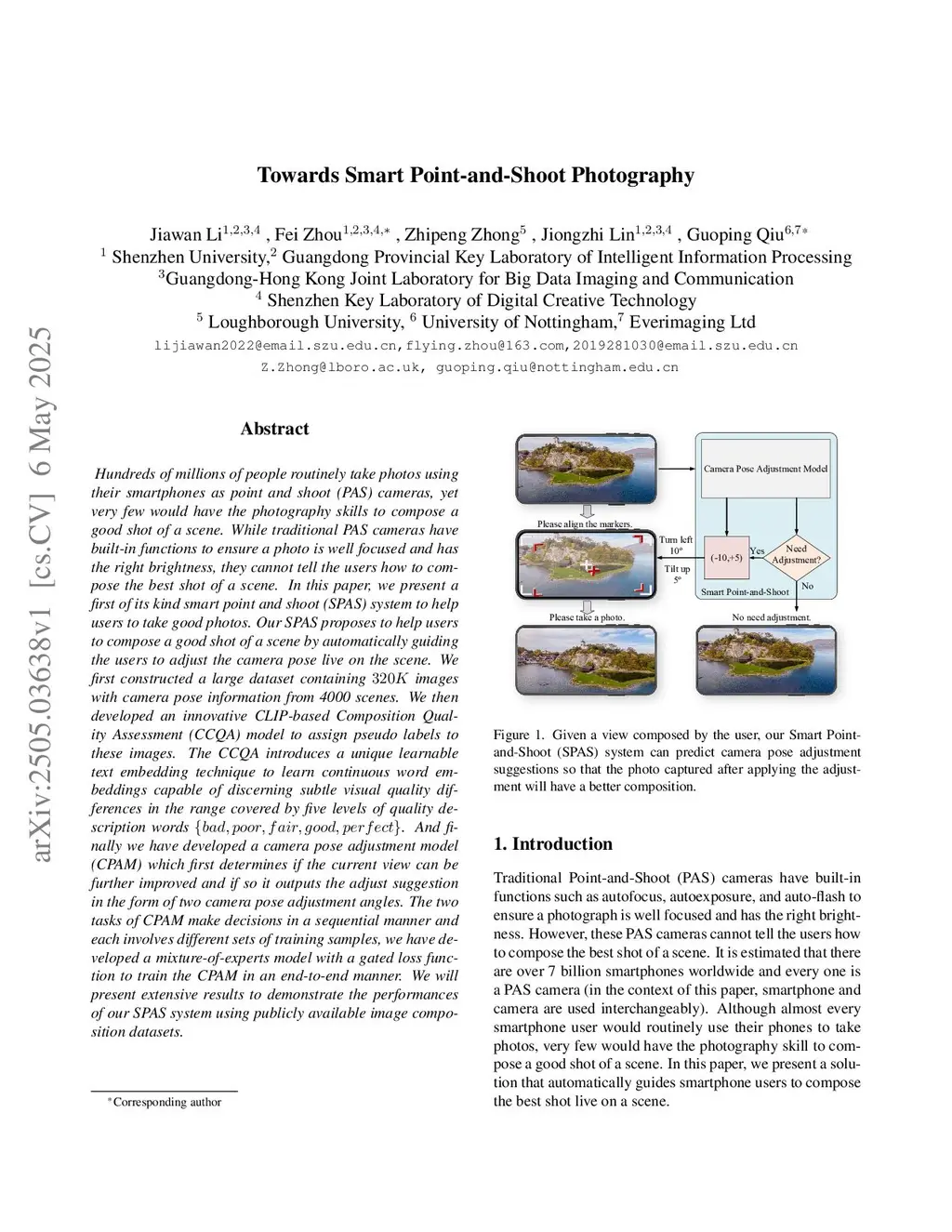 Hundreds of millions of people routinely take photos using their smartphones as point and shoot (PAS) cameras, yet very few would have the photography skills to compose a good shot of a scene. While traditional PAS cameras have built-in functions to ensure a photo is well focused and has the right brightness, they cannot tell the users how to compose the best shot of a scene. In this paper, we present a first of its kind smart point and shoot (SPAS) system to help users to take good photos. Our SPAS proposes to help users to compose a good shot of a scene by automatically guiding the users to adjust the camera pose live on the scene. We first constructed a large dataset containing 320K images with camera pose information from 4000 scenes. We then developed an innovative CLIP-based Composition Quality Assessment (CCQA) model to assign pseudo labels to these images. The CCQA introduces a unique learnable text embedding technique to learn continuous word embeddings capable of discerning subtle visual quality differences in the range covered by five levels of quality description words {bad, poor, fair, good, perfect}. And finally we have developed a camera pose adjustment model (CPAM) which first determines if the current view can be further improved and if so it outputs the adjust suggestion in the form of two camera pose adjustment angles. The two tasks of CPAM make decisions in a sequential manner and each involves different sets of training samples, we have developed a mixture-of-experts model with a gated loss function to train the CPAM in an end-to-end manner. We will present extensive results to demonstrate the performances of our SPAS system using publicly available image composition datasets.
