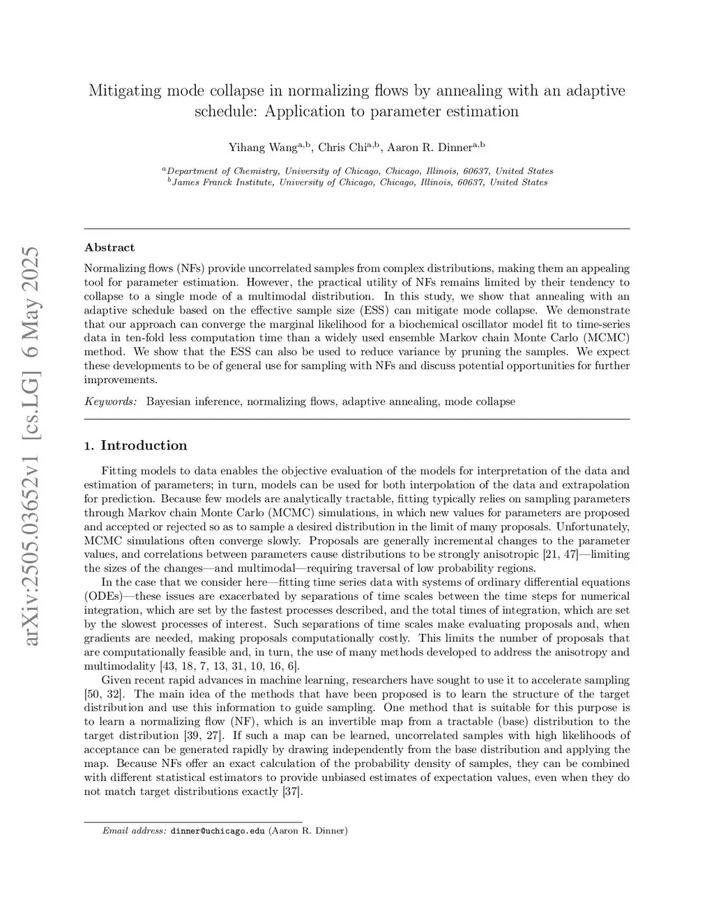 Normalizing flows (NFs) provide uncorrelated samples from complex distributions, making them an appealing tool for parameter estimation. However, the practical utility of NFs remains limited by their tendency to collapse to a single mode of a multimodal distribution. In this study, we show that annealing with an adaptive schedule based on the effective sample size (ESS) can mitigate mode collapse. We demonstrate that our approach can converge the marginal likelihood for a biochemical oscillator model fit to time-series data in ten-fold less computation time than a widely used ensemble Markov chain Monte Carlo (MCMC) method. We show that the ESS can also be used to reduce variance by pruning the samples. We expect these developments to be of general use for sampling with NFs and discuss potential opportunities for further improvements.