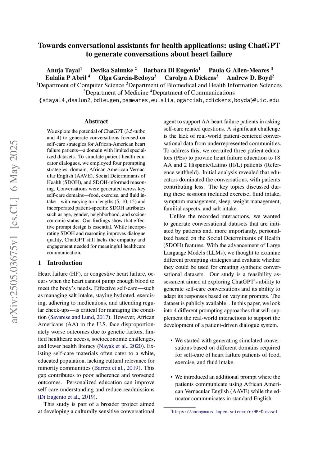 We explore the potential of ChatGPT (3.5-turbo and 4) to generate conversations focused on self-care strategies for African-American heart failure patients -- a domain with limited specialized datasets. To simulate patient-health educator dialogues, we employed four prompting strategies: domain, African American Vernacular English (AAVE), Social Determinants of Health (SDOH), and SDOH-informed reasoning. Conversations were generated across key self-care domains of food, exercise, and fluid intake, with varying turn lengths (5, 10, 15) and incorporated patient-specific SDOH attributes such as age, gender, neighborhood, and socioeconomic status. Our findings show that effective prompt design is essential. While incorporating SDOH and reasoning improves dialogue quality, ChatGPT still lacks the empathy and engagement needed for meaningful healthcare communication.