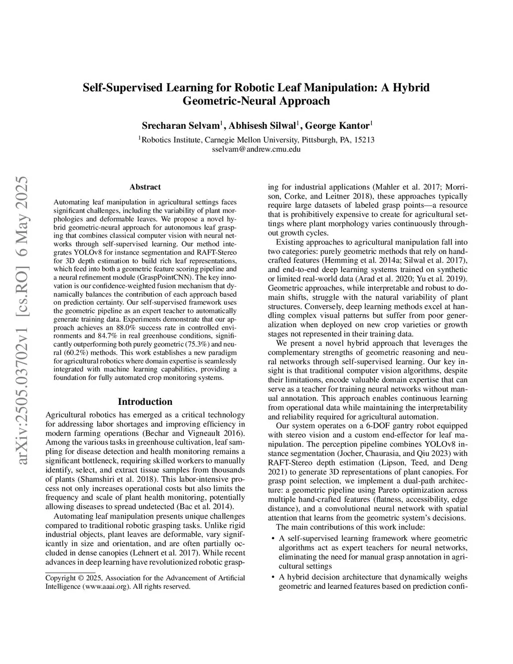 Self-Supervised Learning for Robotic Leaf Manipulation: A Hybrid Geometric-Neural Approach