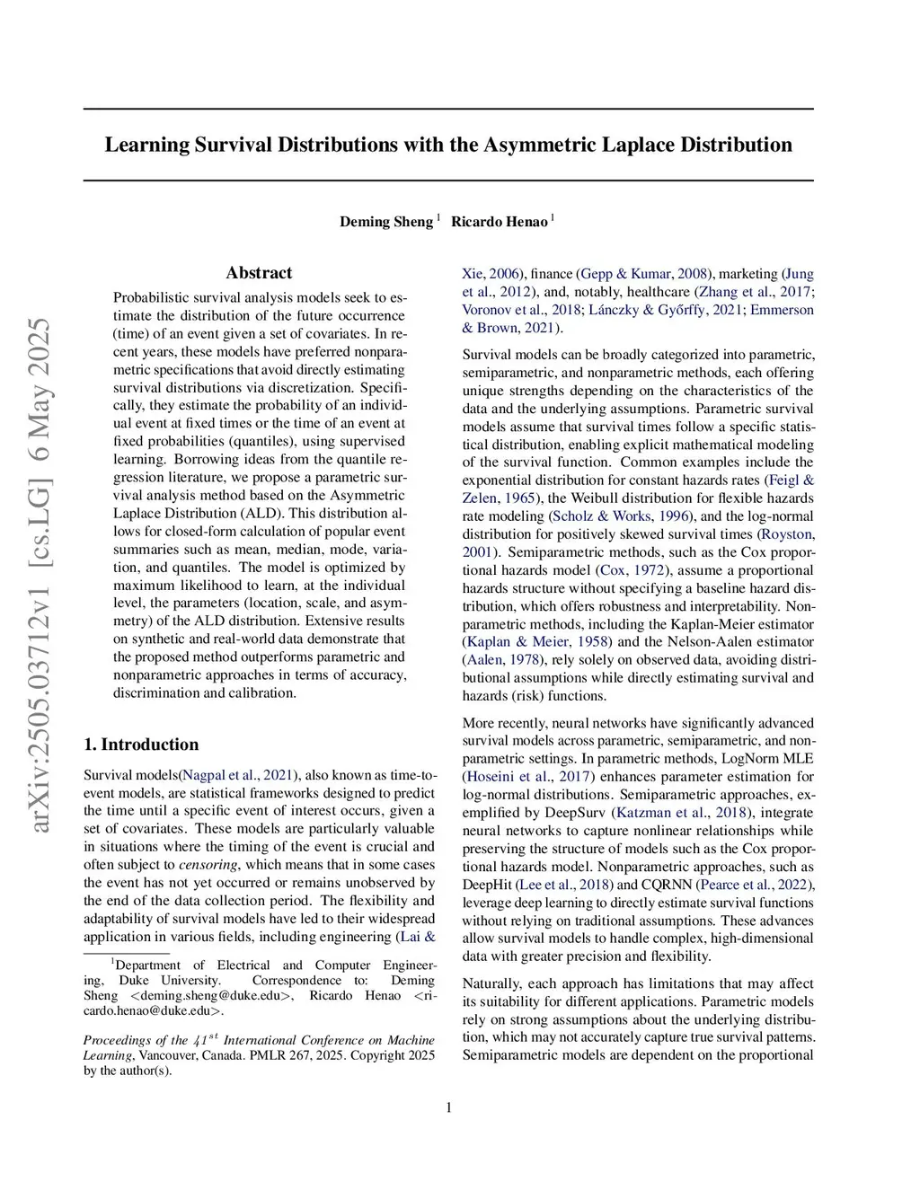 Probabilistic survival analysis models seek to estimate the distribution of the future occurrence (time) of an event given a set of covariates. In recent years, these models have preferred nonparametric specifications that avoid directly estimating survival distributions via discretization. Specifically, they estimate the probability of an individual event at fixed times or the time of an event at fixed probabilities (quantiles), using supervised learning. Borrowing ideas from the quantile regression literature, we propose a parametric survival analysis method based on the Asymmetric Laplace Distribution (ALD). This distribution allows for closed-form calculation of popular event summaries such as mean, median, mode, variation, and quantiles. The model is optimized by maximum likelihood to learn, at the individual level, the parameters (location, scale, and asymmetry) of the ALD distribution. Extensive results on synthetic and real-world data demonstrate that the proposed method outperforms parametric and nonparametric approaches in terms of accuracy, discrimination and calibration.