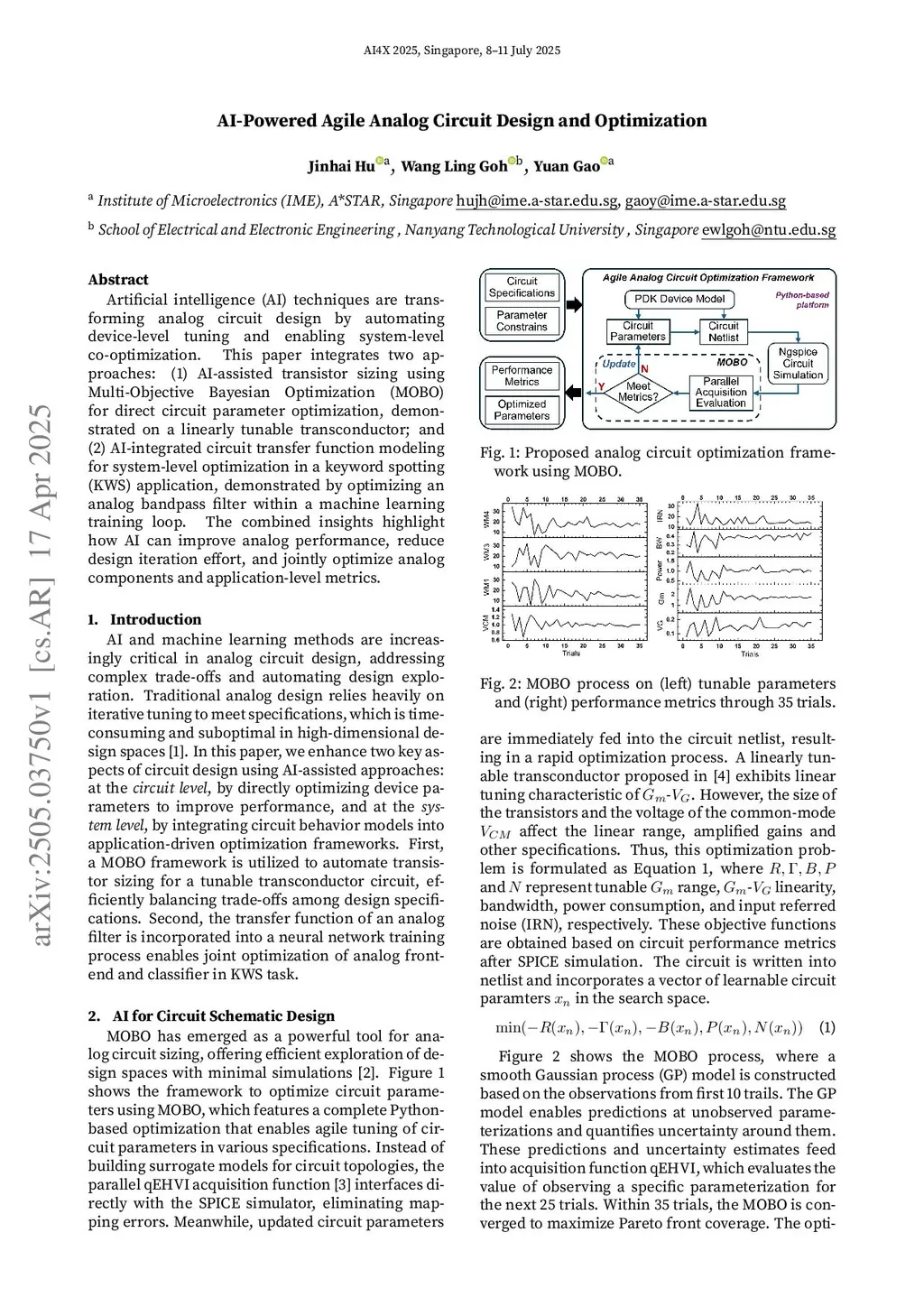 Artificial intelligence (AI) techniques are transforming analog circuit design by automating device-level tuning and enabling system-level co-optimization. This paper integrates two approaches: (1) AI-assisted transistor sizing using Multi-Objective Bayesian Optimization (MOBO) for direct circuit parameter optimization, demonstrated on a linearly tunable transconductor; and (2) AI-integrated circuit transfer function modeling for system-level optimization in a keyword spotting (KWS) application, demonstrated by optimizing an analog bandpass filter within a machine learning training loop. The combined insights highlight how AI can improve analog performance, reduce design iteration effort, and jointly optimize analog components and application-level metrics.