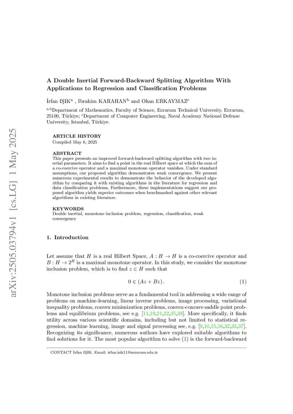 This paper presents an improved forward-backward splitting algorithm with two inertial parameters. It aims to find a point in the real Hilbert space at which the sum of a co-coercive operator and a maximal monotone operator vanishes. Under standard assumptions, our proposed algorithm demonstrates weak convergence. We present numerous experimental results to demonstrate the behavior of the developed algorithm by comparing it with existing algorithms in the literature for regression and data classification problems. Furthermore, these implementations suggest our proposed algorithm yields superior outcomes when benchmarked against other relevant algorithms in existing literature.