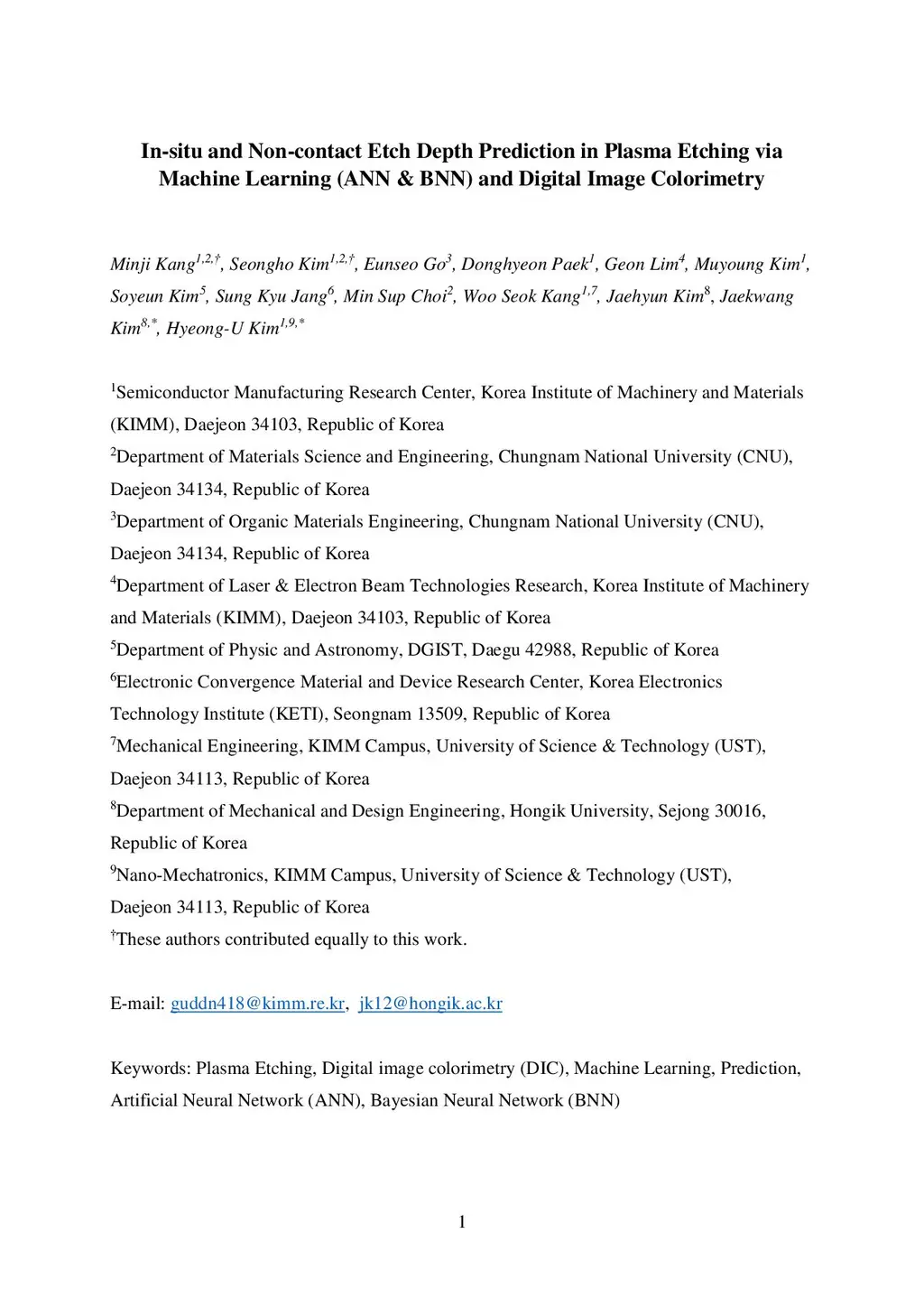 In-situ and Non-contact Etch Depth Prediction in Plasma Etching via Machine Learning (ANN & BNN) and Digital Image Colorimetry
