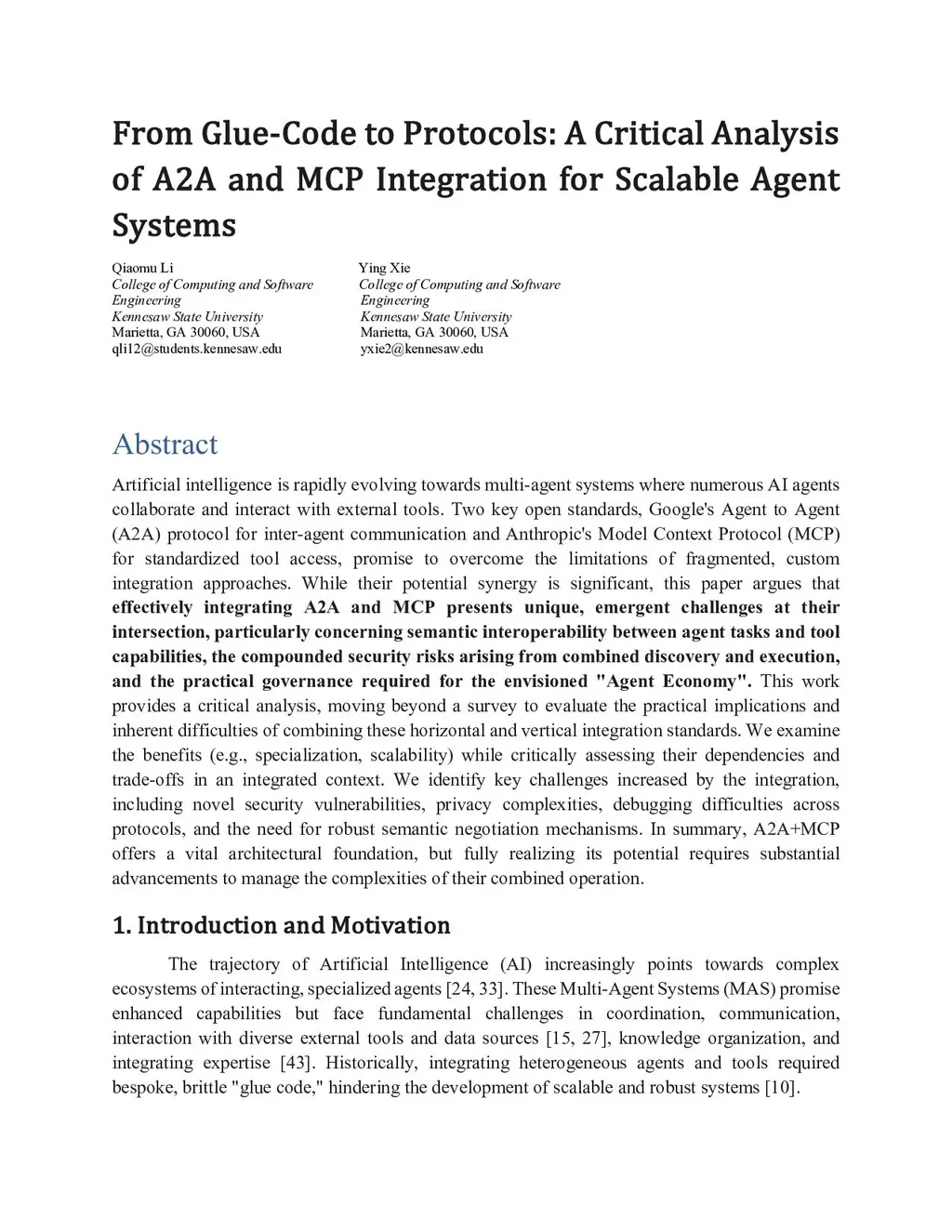 From Glue-Code to Protocols: A Critical Analysis of A2A and MCP Integration for Scalable Agent Systems