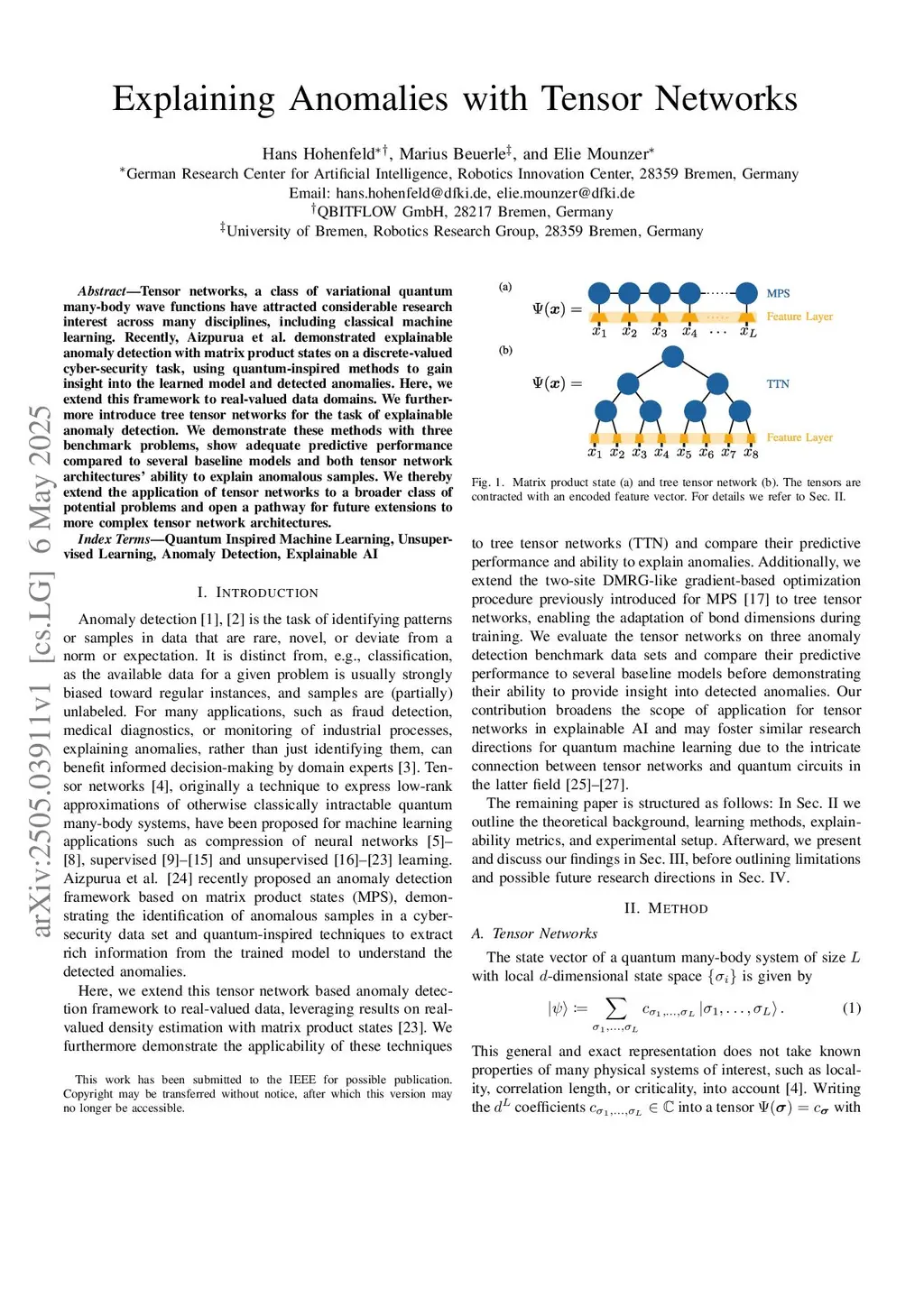 Tensor networks, a class of variational quantum many-body wave functions have attracted considerable research interest across many disciplines, including classical machine learning. Recently, Aizpurua et al. demonstrated explainable anomaly detection with matrix product states on a discrete-valued cyber-security task, using quantum-inspired methods to gain insight into the learned model and detected anomalies. Here, we extend this framework to real-valued data domains. We furthermore introduce tree tensor networks for the task of explainable anomaly detection. We demonstrate these methods with three benchmark problems, show adequate predictive performance compared to several baseline models and both tensor network architectures' ability to explain anomalous samples. We thereby extend the application of tensor networks to a broader class of potential problems and open a pathway for future extensions to more complex tensor network architectures.