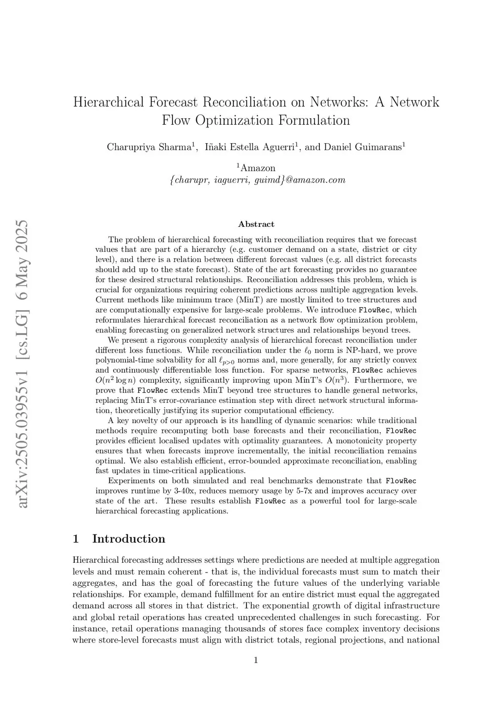 Hierarchical forecasting with reconciliation requires forecasting values of a hierarchy (e.g.~customer demand in a state and district), such that forecast values are linked (e.g.~ district forecasts should add up to the state forecast). Basic forecasting provides no guarantee for these desired structural relationships. Reconciliation addresses this problem, which is crucial for organizations requiring coherent predictions across multiple aggregation levels. Current methods like minimum trace (MinT) are mostly limited to tree structures and are computationally expensive. We introduce FlowRec, which reformulates hierarchical forecast reconciliation as a network flow optimization, enabling forecasting on generalized network structures. While reconciliation under the norm is NP-hard, we prove polynomial-time solvability for all norms and , for any strictly convex and continuously differentiable loss function. For sparse networks, FlowRec achieves complexity, significantly improving upon MinT's . Furthermore, we prove that FlowRec extends MinT to handle general networks, replacing MinT's error-covariance estimation step with direct network structural information. A key novelty of our approach is its handling of dynamic scenarios: while traditional methods recompute both base forecasts and reconciliation, FlowRec provides efficient localised updates with optimality guarantees. Monotonicity ensures that when forecasts improve incrementally, the initial reconciliation remains optimal. We also establish efficient, error-bounded approximate reconciliation, enabling fast updates in time-critical applications. Experiments on both simulated and real benchmarks demonstrate that FlowRec improves accuracy, runtime by 3-40x and memory usage by 5-7x. These results establish FlowRec as a powerful tool for large-scale hierarchical forecasting applications.