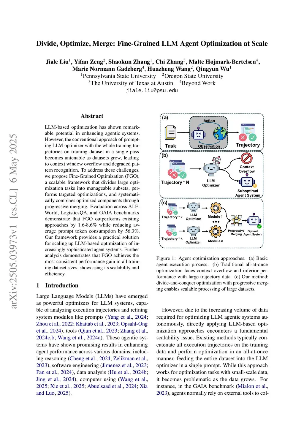 LLM-based optimization has shown remarkable potential in enhancing agentic systems. However, the conventional approach of prompting LLM optimizer with the whole training trajectories on training dataset in a single pass becomes untenable as datasets grow, leading to context window overflow and degraded pattern recognition. To address these challenges, we propose Fine-Grained Optimization (FGO), a scalable framework that divides large optimization tasks into manageable subsets, performs targeted optimizations, and systematically combines optimized components through progressive merging. Evaluation across ALFWorld, LogisticsQA, and GAIA benchmarks demonstrate that FGO outperforms existing approaches by 1.6-8.6% while reducing average prompt token consumption by 56.3%. Our framework provides a practical solution for scaling up LLM-based optimization of increasingly sophisticated agent systems. Further analysis demonstrates that FGO achieves the most consistent performance gain in all training dataset sizes, showcasing its scalability and efficiency.