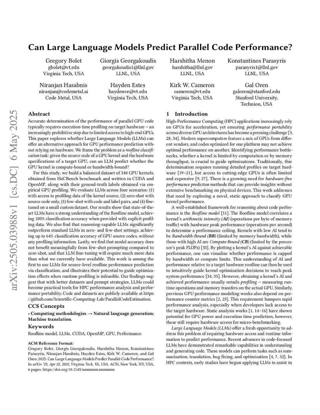 Accurate determination of the performance of parallel GPU code typically requires execution-time profiling on target hardware -- an increasingly prohibitive step due to limited access to high-end GPUs. This paper explores whether Large Language Models (LLMs) can offer an alternative approach for GPU performance prediction without relying on hardware. We frame the problem as a roofline classification task: given the source code of a GPU kernel and the hardware specifications of a target GPU, can an LLM predict whether the GPU kernel is compute-bound or bandwidth-bound?For this study, we build a balanced dataset of 340 GPU kernels, obtained from HeCBench benchmark and written in CUDA and OpenMP, along with their ground-truth labels obtained via empirical GPU profiling. We evaluate LLMs across four scenarios: (1) with access to profiling data of the kernel source, (2) zero-shot with source code only, (3) few-shot with code and label pairs, and (4) fine-tuned on a small custom dataset.Our results show that state-of-the-art LLMs have a strong understanding of the Roofline model, achieving 100% classification accuracy when provided with explicit profiling data. We also find that reasoning-capable LLMs significantly outperform standard LLMs in zero- and few-shot settings, achieving up to 64% accuracy on GPU source codes, without profiling information. Lastly, we find that LLM fine-tuning will require much more data than what we currently have available.This work is among the first to use LLMs for source-level roofline performance prediction via classification, and illustrates their potential to guide optimization efforts when runtime profiling is infeasible. Our findings suggest that with better datasets and prompt strategies, LLMs could become practical tools for HPC performance analysis and performance portability.