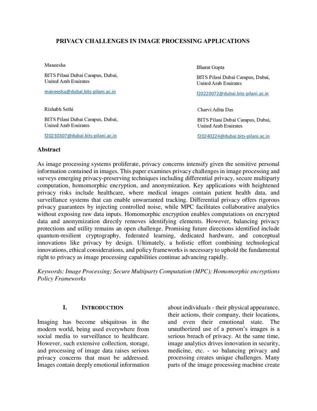 As image processing systems proliferate, privacy concerns intensify given the sensitive personal information contained in images. This paper examines privacy challenges in image processing and surveys emerging privacy-preserving techniques including differential privacy, secure multiparty computation, homomorphic encryption, and anonymization. Key applications with heightened privacy risks include healthcare, where medical images contain patient health data, and surveillance systems that can enable unwarranted tracking. Differential privacy offers rigorous privacy guarantees by injecting controlled noise, while MPC facilitates collaborative analytics without exposing raw data inputs. Homomorphic encryption enables computations on encrypted data and anonymization directly removes identifying elements. However, balancing privacy protections and utility remains an open challenge. Promising future directions identified include quantum-resilient cryptography, federated learning, dedicated hardware, and conceptual innovations like privacy by design. Ultimately, a holistic effort combining technological innovations, ethical considerations, and policy frameworks is necessary to uphold the fundamental right to privacy as image processing capabilities continue advancing rapidly.