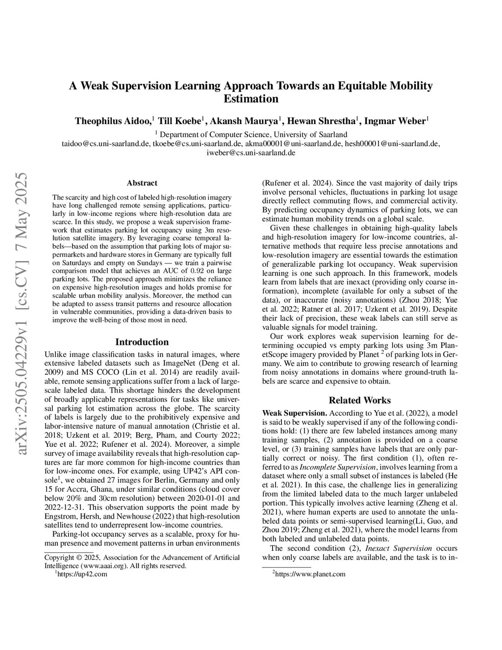 The scarcity and high cost of labeled high-resolution imagery have long challenged remote sensing applications, particularly in low-income regions where high-resolution data are scarce. In this study, we propose a weak supervision framework that estimates parking lot occupancy using 3m resolution satellite imagery. By leveraging coarse temporal labels -- based on the assumption that parking lots of major supermarkets and hardware stores in Germany are typically full on Saturdays and empty on Sundays -- we train a pairwise comparison model that achieves an AUC of 0.92 on large parking lots. The proposed approach minimizes the reliance on expensive high-resolution images and holds promise for scalable urban mobility analysis. Moreover, the method can be adapted to assess transit patterns and resource allocation in vulnerable communities, providing a data-driven basis to improve the well-being of those most in need.