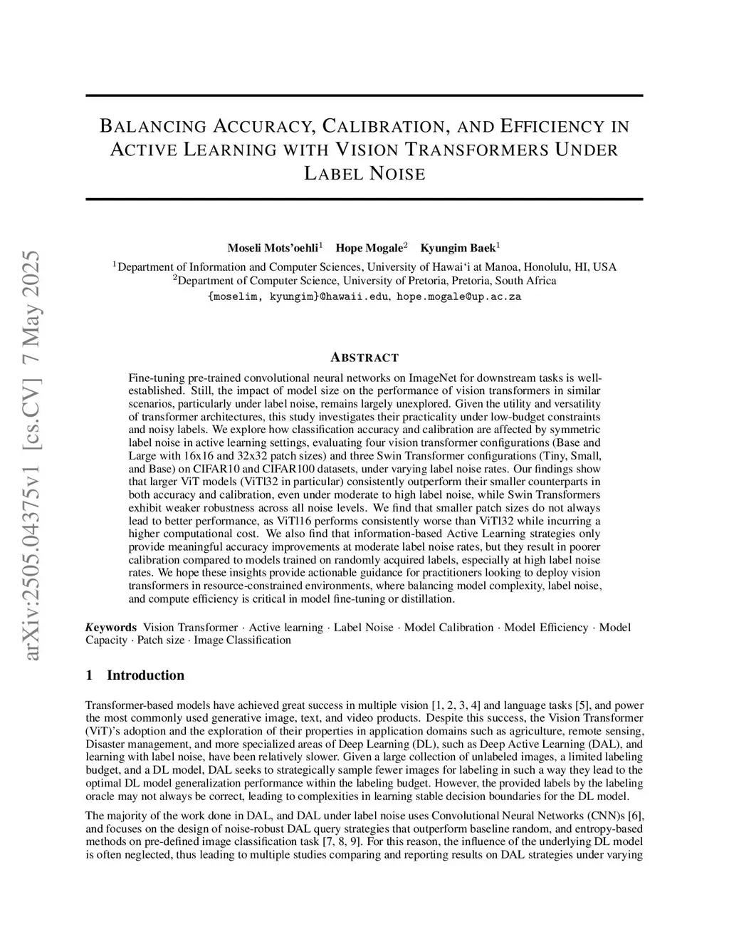 Fine-tuning pre-trained convolutional neural networks on ImageNet for downstream tasks is well-established. Still, the impact of model size on the performance of vision transformers in similar scenarios, particularly under label noise, remains largely unexplored. Given the utility and versatility of transformer architectures, this study investigates their practicality under low-budget constraints and noisy labels. We explore how classification accuracy and calibration are affected by symmetric label noise in active learning settings, evaluating four vision transformer configurations (Base and Large with 16x16 and 32x32 patch sizes) and three Swin Transformer configurations (Tiny, Small, and Base) on CIFAR10 and CIFAR100 datasets, under varying label noise rates. Our findings show that larger ViT models (ViTl32 in particular) consistently outperform their smaller counterparts in both accuracy and calibration, even under moderate to high label noise, while Swin Transformers exhibit weaker robustness across all noise levels. We find that smaller patch sizes do not always lead to better performance, as ViTl16 performs consistently worse than ViTl32 while incurring a higher computational cost. We also find that information-based Active Learning strategies only provide meaningful accuracy improvements at moderate label noise rates, but they result in poorer calibration compared to models trained on randomly acquired labels, especially at high label noise rates. We hope these insights provide actionable guidance for practitioners looking to deploy vision transformers in resource-constrained environments, where balancing model complexity, label noise, and compute efficiency is critical in model fine-tuning or distillation.