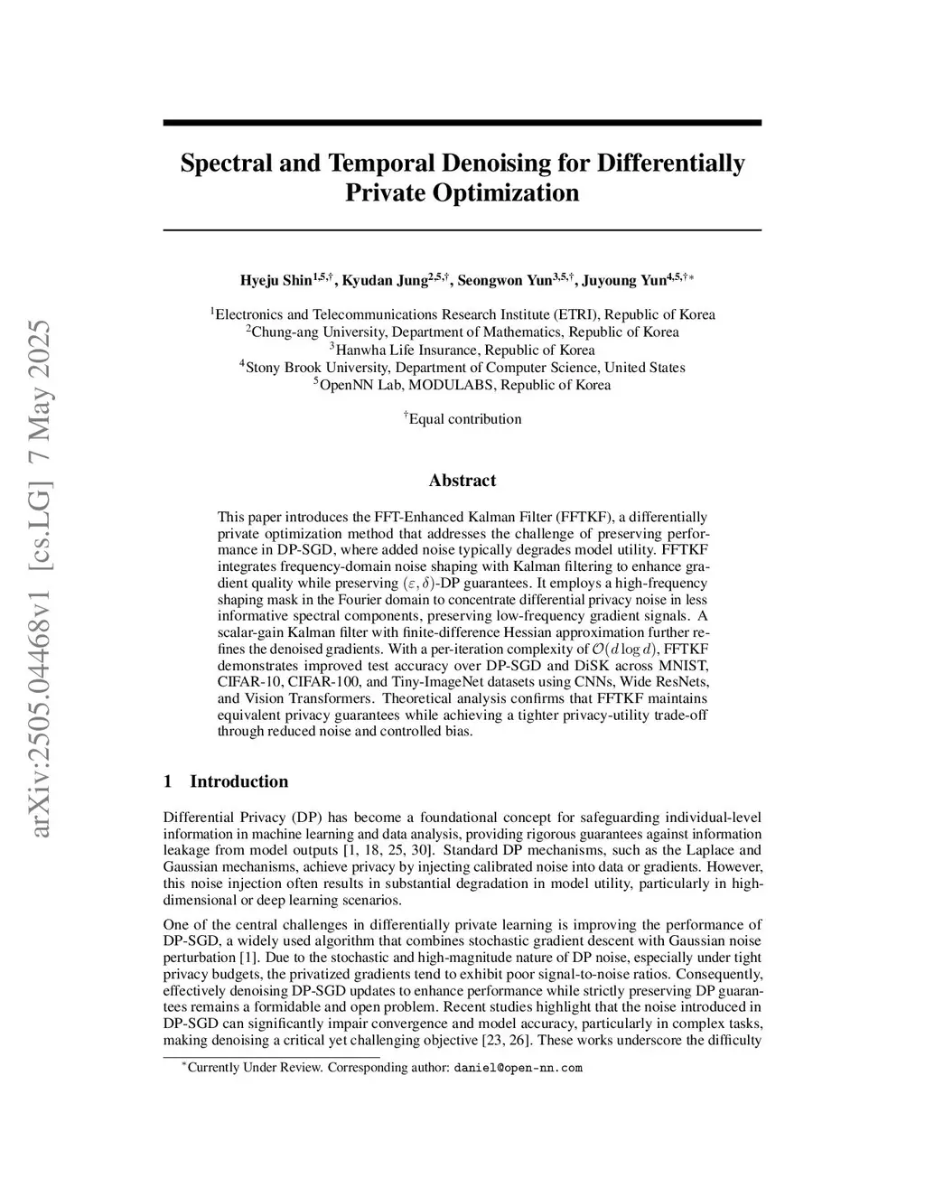 Differential Privacy (DP) has emerged as a key framework for protecting sensitive data in machine learning, but standard DP-SGD often suffers from significant accuracy loss due to injected noise. To address this limitation, we introduce the FFT-Enhanced Kalman Filter (FFTKF), a differentially private optimization method that improves gradient quality while preserving -DP guarantees. FFTKF applies frequency-domain filtering to shift privacy noise into less informative high-frequency components, preserving the low-frequency gradient signals that carry most learning information. A scalar-gain Kalman filter with a finite-difference Hessian approximation further refines the denoised gradients. The method has per-iteration complexity and achieves higher test accuracy than DP-SGD and DiSK on MNIST, CIFAR-10, CIFAR-100, and Tiny-ImageNet with CNNs, Wide ResNets, and Vision Transformers. Theoretical analysis shows that FFTKF ensures equivalent privacy while delivering a stronger privacy--utility trade-off through reduced variance and controlled bias.