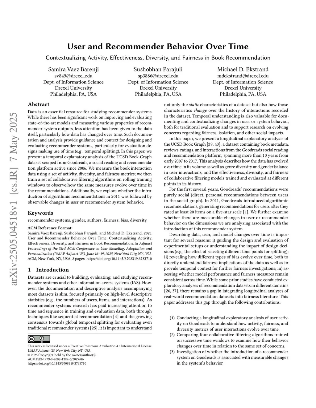 Data is an essential resource for studying recommender systems. While there has been significant work on improving and evaluating state-of-the-art models and measuring various properties of recommender system outputs, less attention has been given to the data itself, particularly how data has changed over time. Such documentation and analysis provide guidance and context for designing and evaluating recommender systems, particularly for evaluation designs making use of time (e.g., temporal splitting). In this paper, we present a temporal explanatory analysis of the UCSD Book Graph dataset scraped from Goodreads, a social reading and recommendation platform active since 2006. We measure the book interaction data using a set of activity, diversity, and fairness metrics; we then train a set of collaborative filtering algorithms on rolling training windows to observe how the same measures evolve over time in the recommendations. Additionally, we explore whether the introduction of algorithmic recommendations in 2011 was followed by observable changes in user or recommender system behavior.