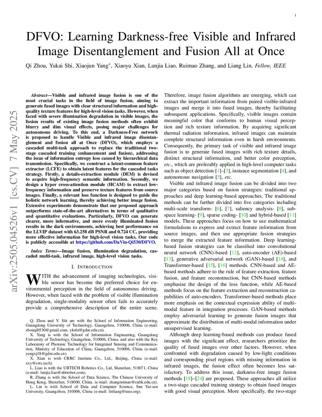Visible and infrared image fusion is one of the most crucial tasks in the field of image fusion, aiming to generate fused images with clear structural information and high-quality texture features for high-level vision tasks. However, when faced with severe illumination degradation in visible images, the fusion results of existing image fusion methods often exhibit blurry and dim visual effects, posing major challenges for autonomous driving. To this end, a Darkness-Free network is proposed to handle Visible and infrared image disentanglement and fusion all at Once (DFVO), which employs a cascaded multi-task approach to replace the traditional two-stage cascaded training (enhancement and fusion), addressing the issue of information entropy loss caused by hierarchical data transmission. Specifically, we construct a latent-common feature extractor (LCFE) to obtain latent features for the cascaded tasks strategy. Firstly, a details-extraction module (DEM) is devised to acquire high-frequency semantic information. Secondly, we design a hyper cross-attention module (HCAM) to extract low-frequency information and preserve texture features from source images. Finally, a relevant loss function is designed to guide the holistic network learning, thereby achieving better image fusion. Extensive experiments demonstrate that our proposed approach outperforms state-of-the-art alternatives in terms of qualitative and quantitative evaluations. Particularly, DFVO can generate clearer, more informative, and more evenly illuminated fusion results in the dark environments, achieving best performance on the LLVIP dataset with 63.258 dB PSNR and 0.724 CC, providing more effective information for high-level vision tasks. Our code is publicly accessible atthis https URL.