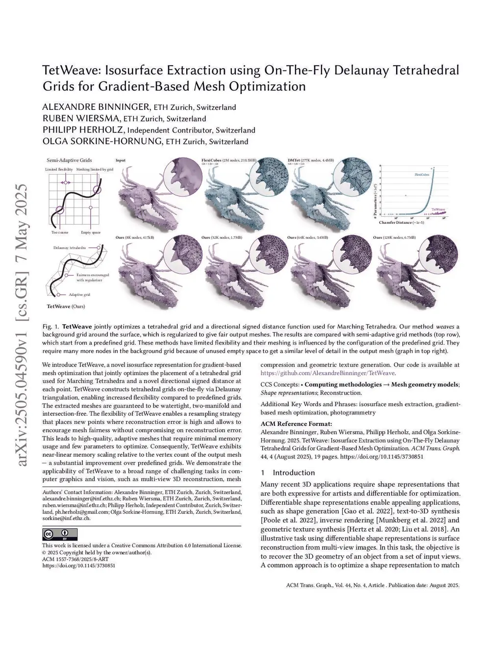 We introduce TetWeave, a novel isosurface representation for gradient-based mesh optimization that jointly optimizes the placement of a tetrahedral grid used for Marching Tetrahedra and a novel directional signed distance at each point. TetWeave constructs tetrahedral grids on-the-fly via Delaunay triangulation, enabling increased flexibility compared to predefined grids. The extracted meshes are guaranteed to be watertight, two-manifold and intersection-free. The flexibility of TetWeave enables a resampling strategy that places new points where reconstruction error is high and allows to encourage mesh fairness without compromising on reconstruction error. This leads to high-quality, adaptive meshes that require minimal memory usage and few parameters to optimize. Consequently, TetWeave exhibits near-linear memory scaling relative to the vertex count of the output mesh - a substantial improvement over predefined grids. We demonstrate the applicability of TetWeave to a broad range of challenging tasks in computer graphics and vision, such as multi-view 3D reconstruction, mesh compression and geometric texture generation.