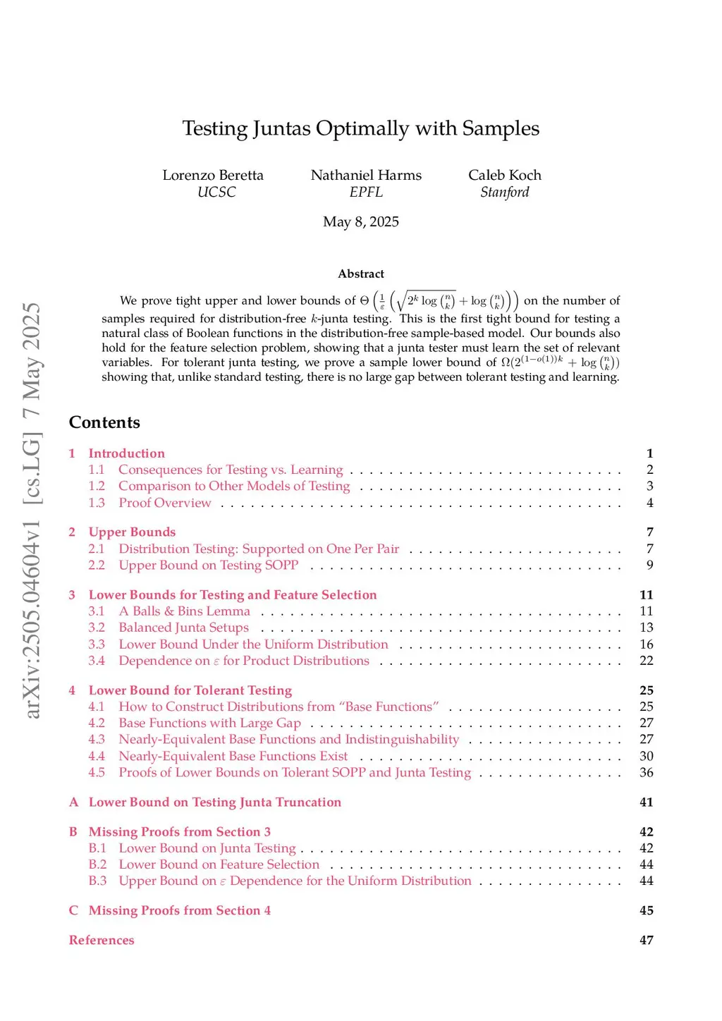 For a function , the junta testing problem asks whether depends on only variables. If depends on only variables, the feature selection problem asks to find those variables. We prove that these two tasks are statistically equivalent. Specifically, we show that the ``brute-force'' algorithm, which checks for any set of variables consistent with the sample, is simultaneously sample-optimal for both problems, and the optimal sample size is \[ \Theta\left(\frac 1 \varepsilon \left( \sqrt{2^k \log {n \choose k}} + \log {n \choose k}\right)\right). \]