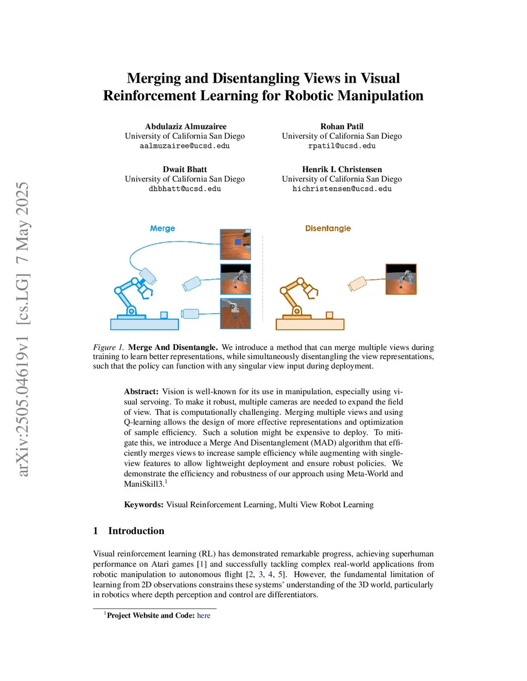 Vision is well-known for its use in manipulation, especially using visual servoing. Due to the 3D nature of the world, using multiple camera views and merging them creates better representations for Q-learning and in turn, trains more sample efficient policies. Nevertheless, these multi-view policies are sensitive to failing cameras and can be burdensome to deploy. To mitigate these issues, we introduce a Merge And Disentanglement (MAD) algorithm that efficiently merges views to increase sample efficiency while simultaneously disentangling views by augmenting multi-view feature inputs with single-view features. This produces robust policies and allows lightweight deployment. We demonstrate the efficiency and robustness of our approach using Meta-World and ManiSkill3. For project website and code, seethis https URL
