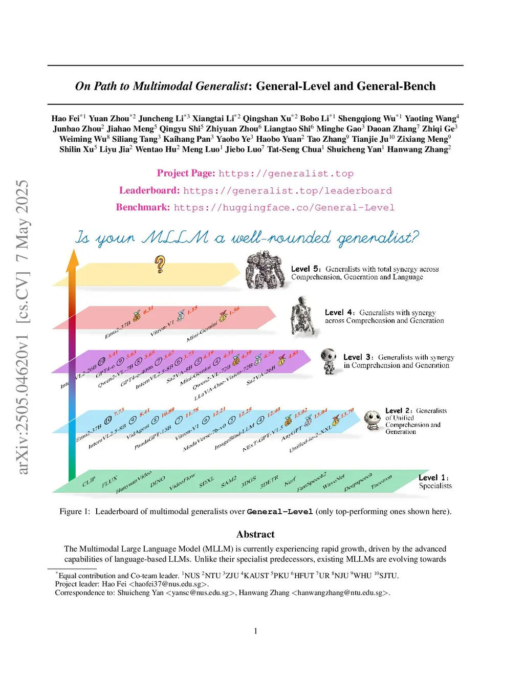 The Multimodal Large Language Model (MLLM) is currently experiencing rapid growth, driven by the advanced capabilities of LLMs. Unlike earlier specialists, existing MLLMs are evolving towards a Multimodal Generalist paradigm. Initially limited to understanding multiple modalities, these models have advanced to not only comprehend but also generate across modalities. Their capabilities have expanded from coarse-grained to fine-grained multimodal understanding and from supporting limited modalities to arbitrary ones. While many benchmarks exist to assess MLLMs, a critical question arises: Can we simply assume that higher performance across tasks indicates a stronger MLLM capability, bringing us closer to human-level AI? We argue that the answer is not as straightforward as it seems. This project introduces General-Level, an evaluation framework that defines 5-scale levels of MLLM performance and generality, offering a methodology to compare MLLMs and gauge the progress of existing systems towards more robust multimodal generalists and, ultimately, towards AGI. At the core of the framework is the concept of Synergy, which measures whether models maintain consistent capabilities across comprehension and generation, and across multiple modalities. To support this evaluation, we present General-Bench, which encompasses a broader spectrum of skills, modalities, formats, and capabilities, including over 700 tasks and 325,800 instances. The evaluation results that involve over 100 existing state-of-the-art MLLMs uncover the capability rankings of generalists, highlighting the challenges in reaching genuine AI. We expect this project to pave the way for future research on next-generation multimodal foundation models, providing a robust infrastructure to accelerate the realization of AGI. Project page:this https URL