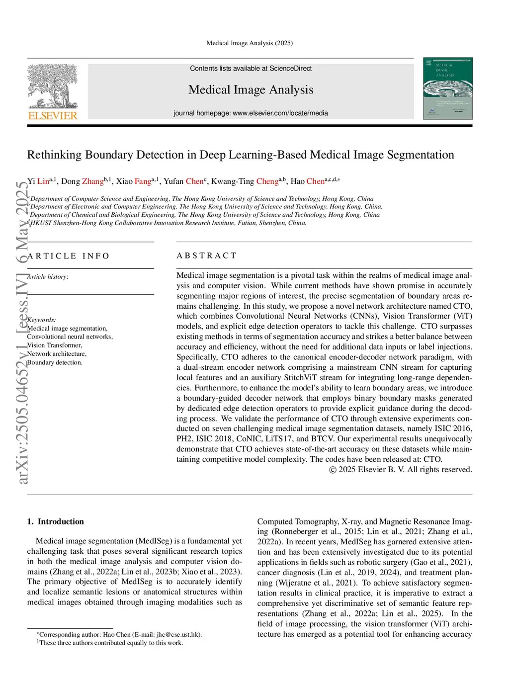 Medical image segmentation is a pivotal task within the realms of medical image analysis and computer vision. While current methods have shown promise in accurately segmenting major regions of interest, the precise segmentation of boundary areas remains challenging. In this study, we propose a novel network architecture named CTO, which combines Convolutional Neural Networks (CNNs), Vision Transformer (ViT) models, and explicit edge detection operators to tackle this challenge. CTO surpasses existing methods in terms of segmentation accuracy and strikes a better balance between accuracy and efficiency, without the need for additional data inputs or label injections. Specifically, CTO adheres to the canonical encoder-decoder network paradigm, with a dual-stream encoder network comprising a mainstream CNN stream for capturing local features and an auxiliary StitchViT stream for integrating long-range dependencies. Furthermore, to enhance the model's ability to learn boundary areas, we introduce a boundary-guided decoder network that employs binary boundary masks generated by dedicated edge detection operators to provide explicit guidance during the decoding process. We validate the performance of CTO through extensive experiments conducted on seven challenging medical image segmentation datasets, namely ISIC 2016, PH2, ISIC 2018, CoNIC, LiTS17, and BTCV. Our experimental results unequivocally demonstrate that CTO achieves state-of-the-art accuracy on these datasets while maintaining competitive model complexity. The codes have been released at:this https URL.