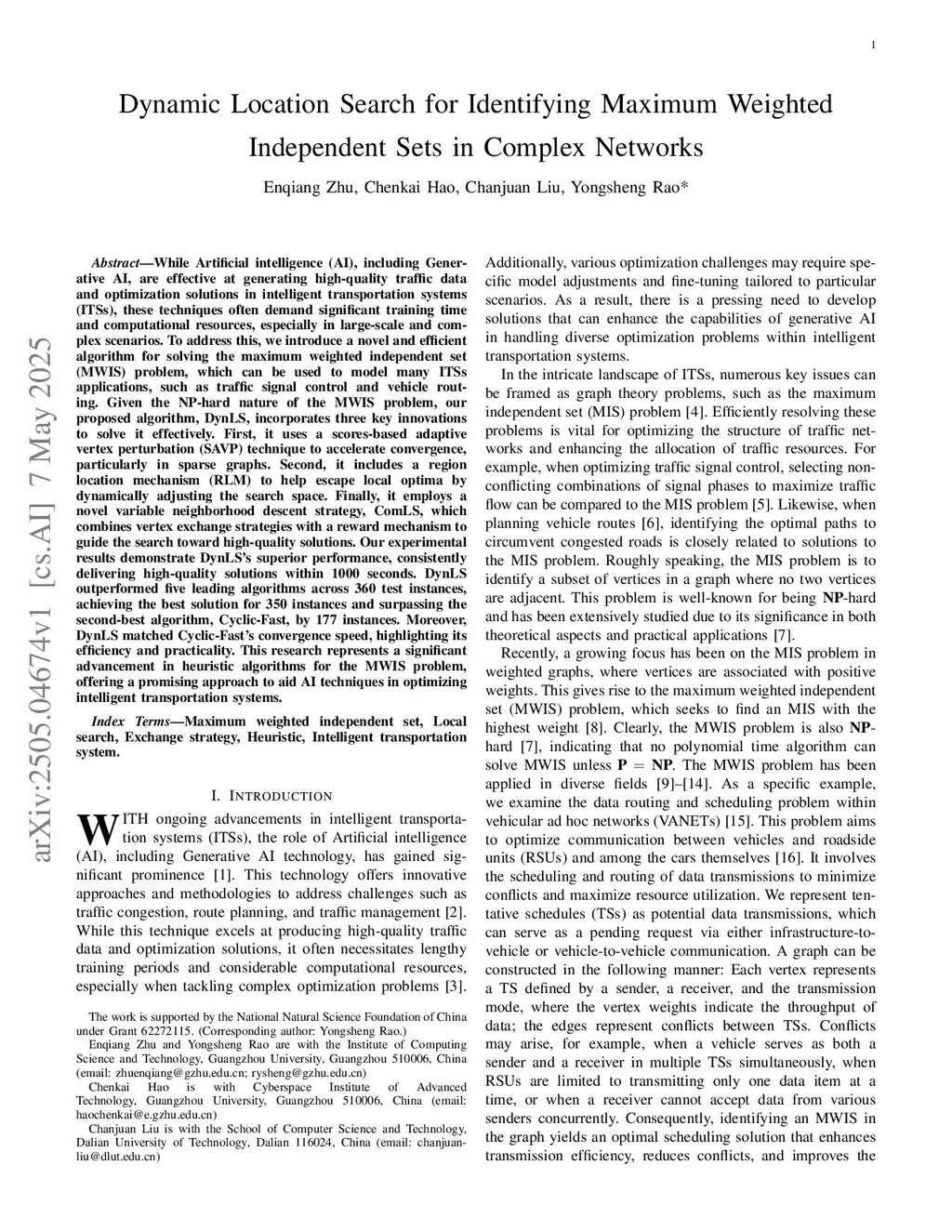 While Artificial intelligence (AI), including Generative AI, are effective at generating high-quality traffic data and optimization solutions in intelligent transportation systems (ITSs), these techniques often demand significant training time and computational resources, especially in large-scale and complex scenarios. To address this, we introduce a novel and efficient algorithm for solving the maximum weighted independent set (MWIS) problem, which can be used to model many ITSs applications, such as traffic signal control and vehicle routing. Given the NP-hard nature of the MWIS problem, our proposed algorithm, DynLS, incorporates three key innovations to solve it effectively. First, it uses a scores-based adaptive vertex perturbation (SAVP) technique to accelerate convergence, particularly in sparse graphs. Second, it includes a region location mechanism (RLM) to help escape local optima by dynamically adjusting the search space. Finally, it employs a novel variable neighborhood descent strategy, ComLS, which combines vertex exchange strategies with a reward mechanism to guide the search toward high-quality solutions. Our experimental results demonstrate DynLS's superior performance, consistently delivering high-quality solutions within 1000 seconds. DynLS outperformed five leading algorithms across 360 test instances, achieving the best solution for 350 instances and surpassing the second-best algorithm, Cyclic-Fast, by 177 instances. Moreover, DynLS matched Cyclic-Fast's convergence speed, highlighting its efficiency and practicality. This research represents a significant advancement in heuristic algorithms for the MWIS problem, offering a promising approach to aid AI techniques in optimizing intelligent transportation systems.