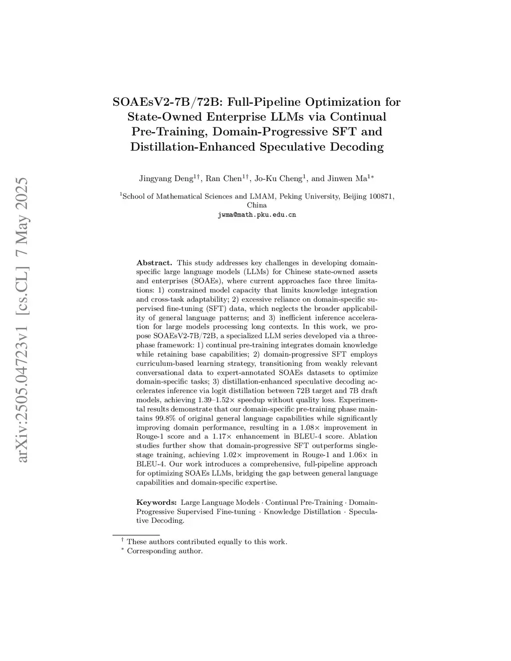 SOAEsV2-7B/72B: Full-Pipeline Optimization for State-Owned Enterprise LLMs via Continual Pre-Training, Domain-Progressive SFT and Distillation-Enhanced Speculative Decoding