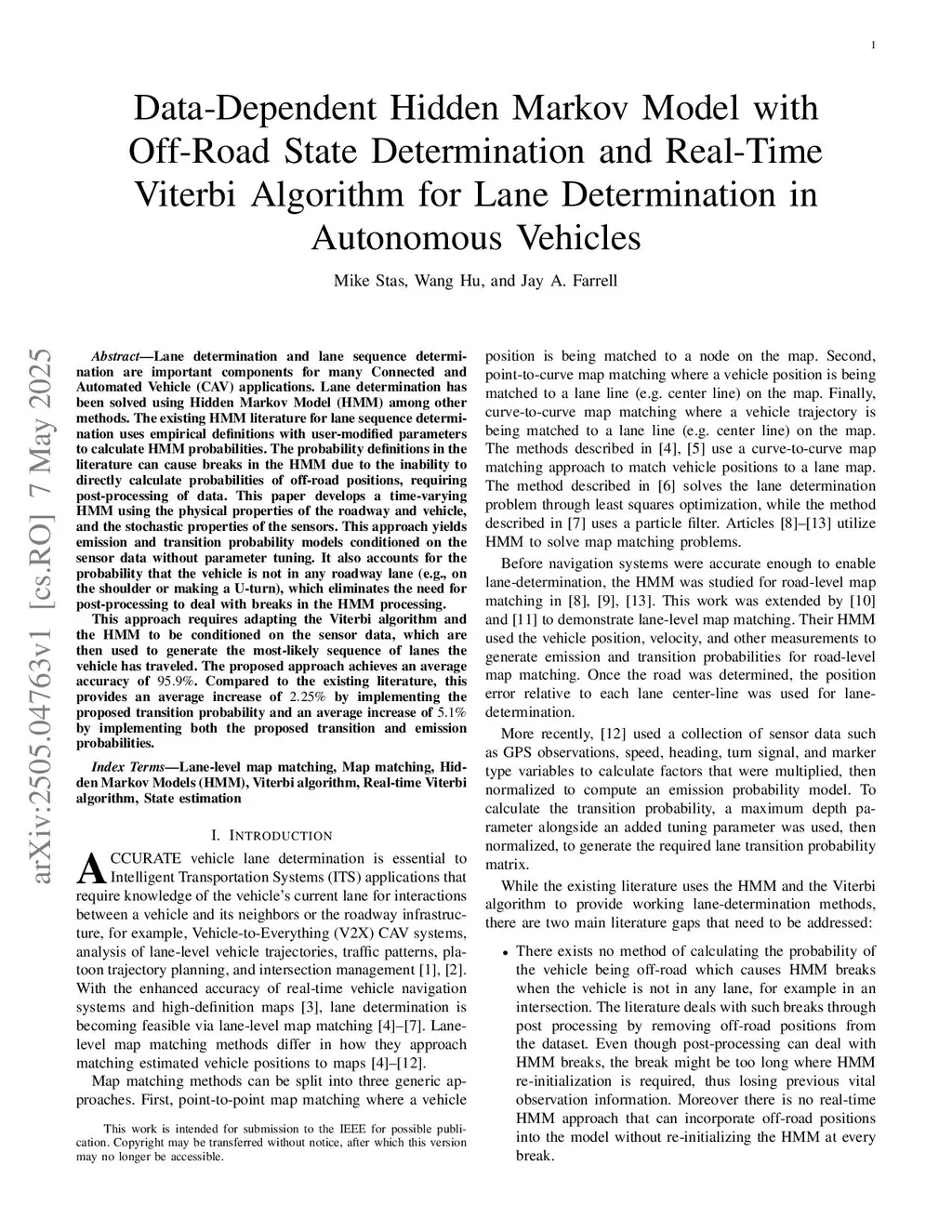 Data-Dependent Hidden Markov Model with Off-Road State Determination and Real-Time Viterbi Algorithm for Lane Determination in Autonomous Vehicles