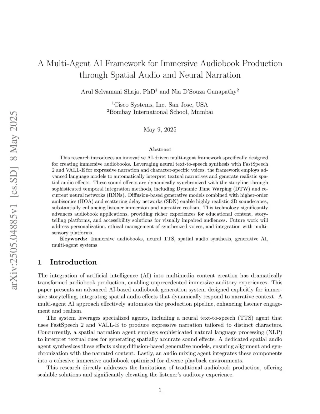 This research introduces an innovative AI-driven multi-agent framework specifically designed for creating immersive audiobooks. Leveraging neural text-to-speech synthesis with FastSpeech 2 and VALL-E for expressive narration and character-specific voices, the framework employs advanced language models to automatically interpret textual narratives and generate realistic spatial audio effects. These sound effects are dynamically synchronized with the storyline through sophisticated temporal integration methods, including Dynamic Time Warping (DTW) and recurrent neural networks (RNNs). Diffusion-based generative models combined with higher-order ambisonics (HOA) and scattering delay networks (SDN) enable highly realistic 3D soundscapes, substantially enhancing listener immersion and narrative realism. This technology significantly advances audiobook applications, providing richer experiences for educational content, storytelling platforms, and accessibility solutions for visually impaired audiences. Future work will address personalization, ethical management of synthesized voices, and integration with multi-sensory platforms.