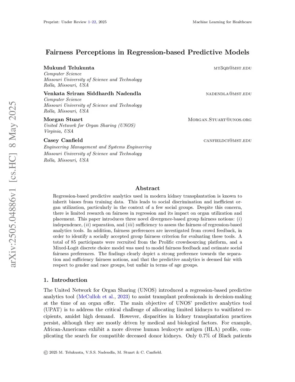 Regression-based predictive analytics used in modern kidney transplantation is known to inherit biases from training data. This leads to social discrimination and inefficient organ utilization, particularly in the context of a few social groups. Despite this concern, there is limited research on fairness in regression and its impact on organ utilization and placement. This paper introduces three novel divergence-based group fairness notions: (i) independence, (ii) separation, and (iii) sufficiency to assess the fairness of regression-based analytics tools. In addition, fairness preferences are investigated from crowd feedback, in order to identify a socially accepted group fairness criterion for evaluating these tools. A total of 85 participants were recruited from the Prolific crowdsourcing platform, and a Mixed-Logit discrete choice model was used to model fairness feedback and estimate social fairness preferences. The findings clearly depict a strong preference towards the separation and sufficiency fairness notions, and that the predictive analytics is deemed fair with respect to gender and race groups, but unfair in terms of age groups.