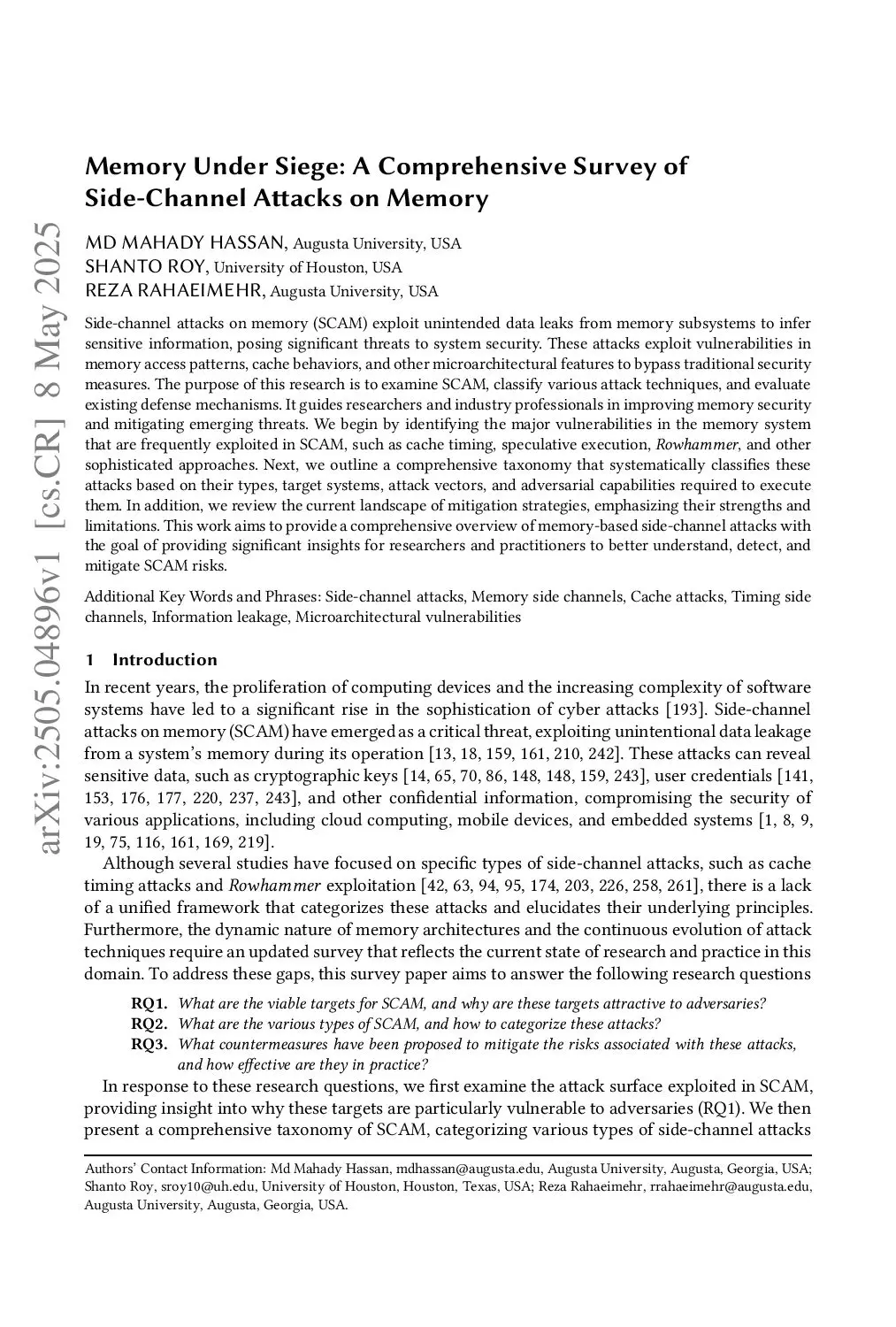 Side-channel attacks on memory (SCAM) exploit unintended data leaks from memory subsystems to infer sensitive information, posing significant threats to system security. These attacks exploit vulnerabilities in memory access patterns, cache behaviors, and other microarchitectural features to bypass traditional security measures. The purpose of this research is to examine SCAM, classify various attack techniques, and evaluate existing defense mechanisms. It guides researchers and industry professionals in improving memory security and mitigating emerging threats. We begin by identifying the major vulnerabilities in the memory system that are frequently exploited in SCAM, such as cache timing, speculative execution, \textit{Rowhammer}, and other sophisticated approaches. Next, we outline a comprehensive taxonomy that systematically classifies these attacks based on their types, target systems, attack vectors, and adversarial capabilities required to execute them. In addition, we review the current landscape of mitigation strategies, emphasizing their strengths and limitations. This work aims to provide a comprehensive overview of memory-based side-channel attacks with the goal of providing significant insights for researchers and practitioners to better understand, detect, and mitigate SCAM risks.