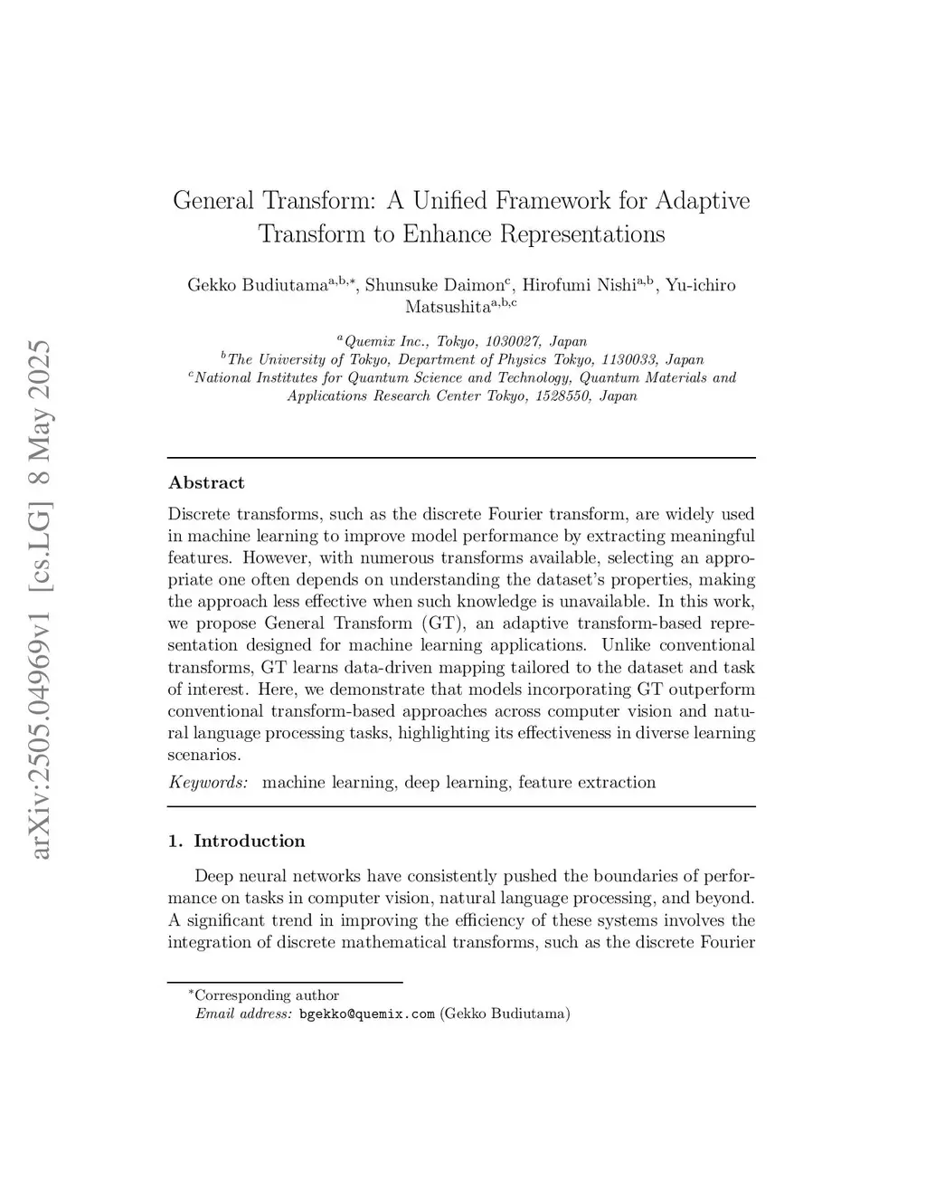 Discrete transforms, such as the discrete Fourier transform, are widely used in machine learning to improve model performance by extracting meaningful features. However, with numerous transforms available, selecting an appropriate one often depends on understanding the dataset's properties, making the approach less effective when such knowledge is unavailable. In this work, we propose General Transform (GT), an adaptive transform-based representation designed for machine learning applications. Unlike conventional transforms, GT learns data-driven mapping tailored to the dataset and task of interest. Here, we demonstrate that models incorporating GT outperform conventional transform-based approaches across computer vision and natural language processing tasks, highlighting its effectiveness in diverse learning scenarios.
